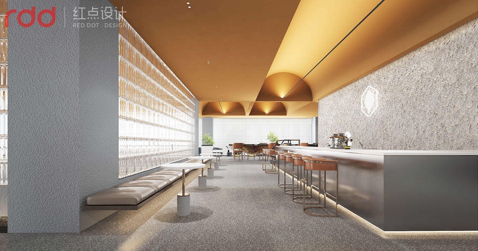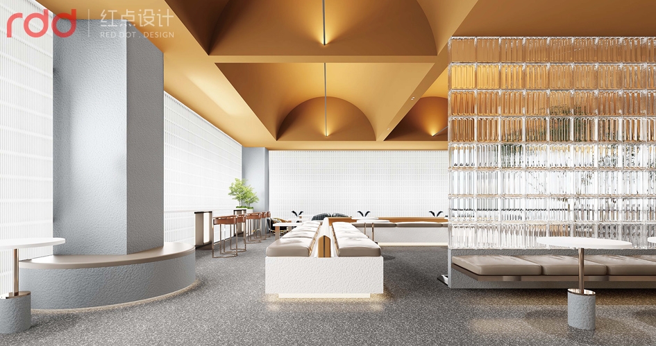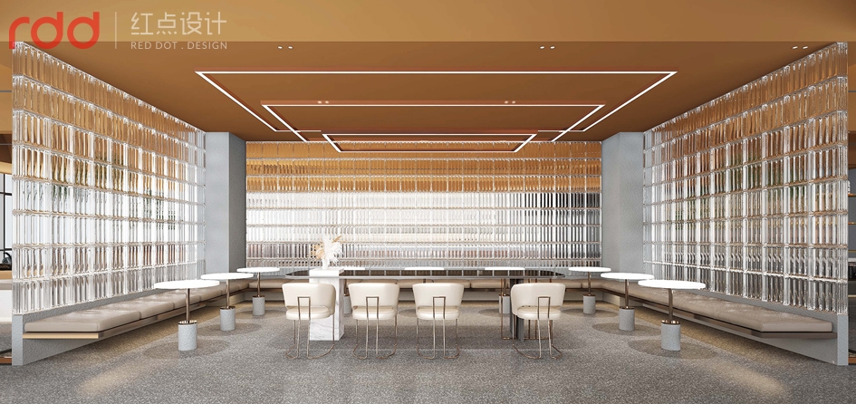 進入公司放棄了傳統(tǒng)公司前臺理念,以水吧和洽談區(qū)為一體,背后的文化墻體現(xiàn)了初茶的LOGO,配合企業(yè)VI,以延續(xù)“初茶”品牌現(xiàn)代茶飲文化,打造體驗感展廳,初茶初衷,只做茶臻品。因此展廳吊頂大面積使用金色,讓整個空間透露出高貴,雅致且簡約潮流的氣息。展廳造獨立玻璃磚端景,令洽談區(qū)的獨立性,展廳的穿透性大氣又時尚,又能讓人聯(lián)想到人與自然的結合,天人合一的思想由然而已生。