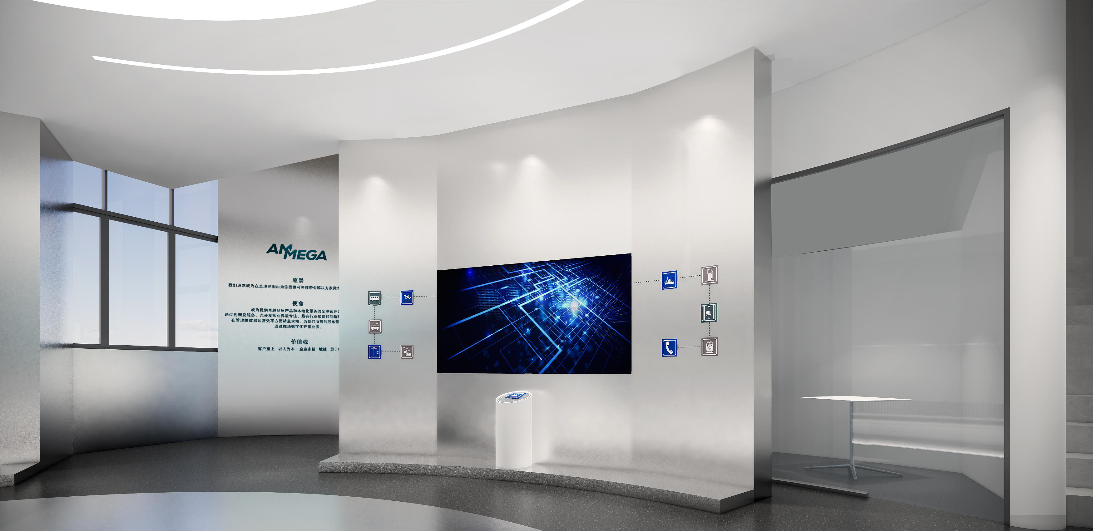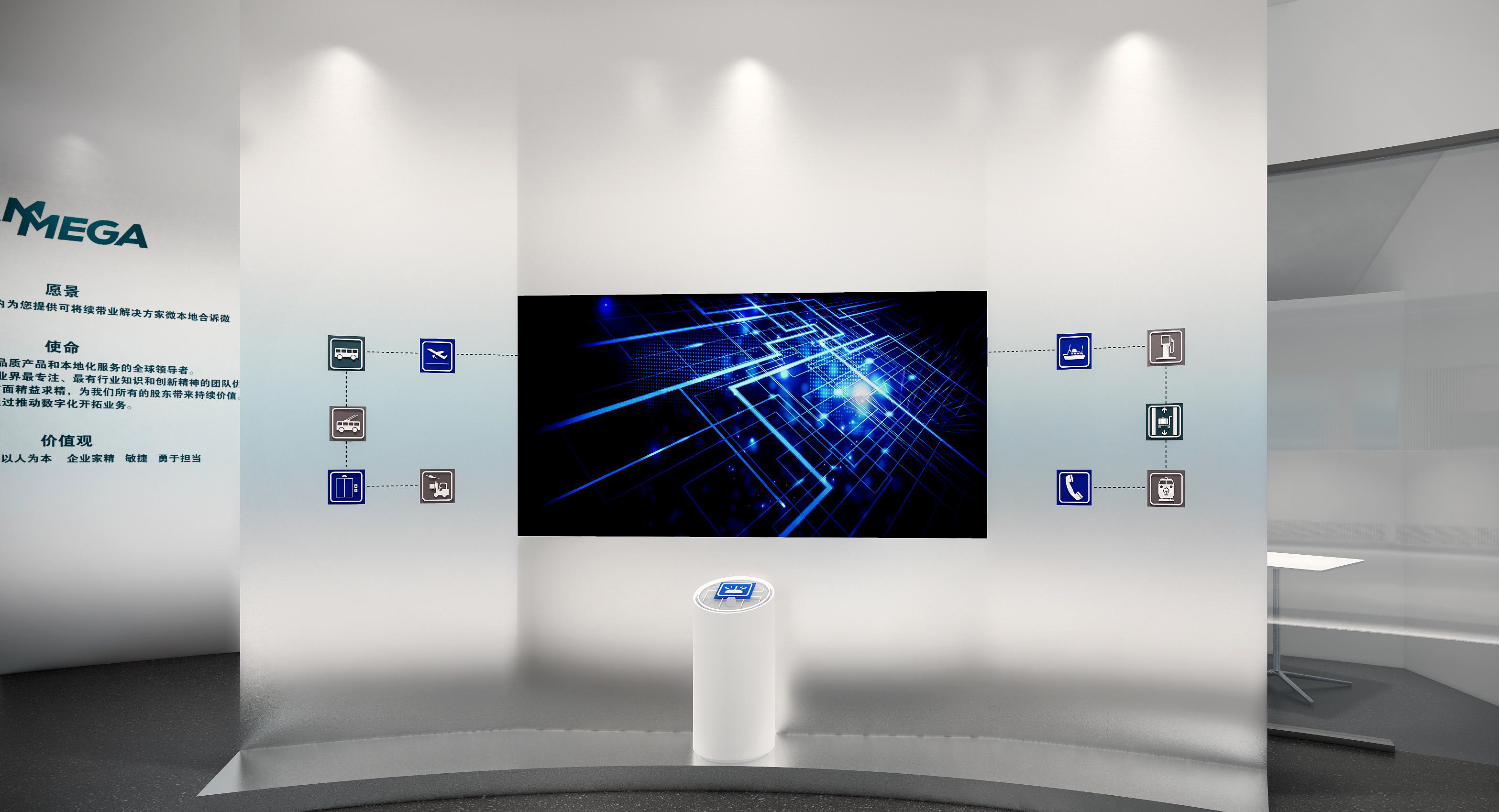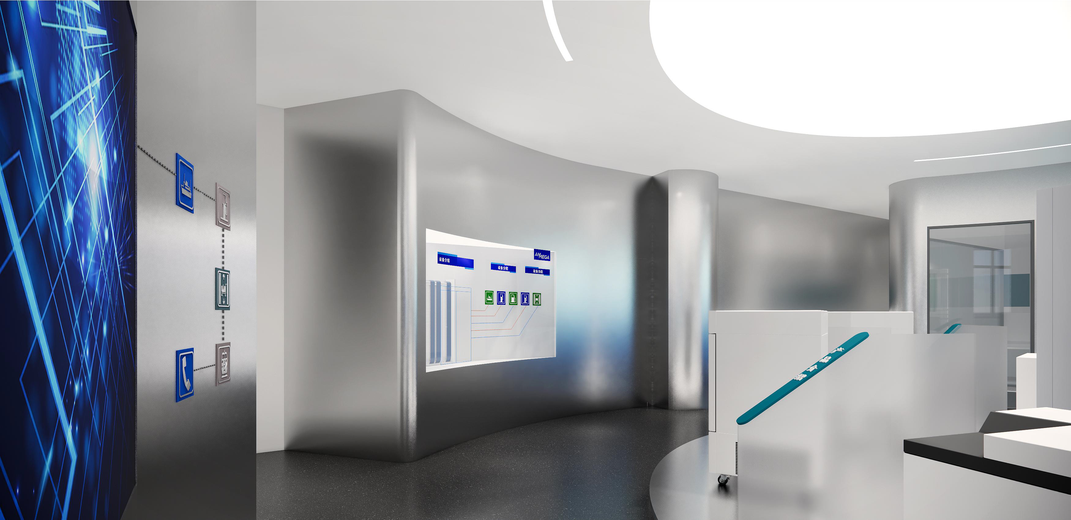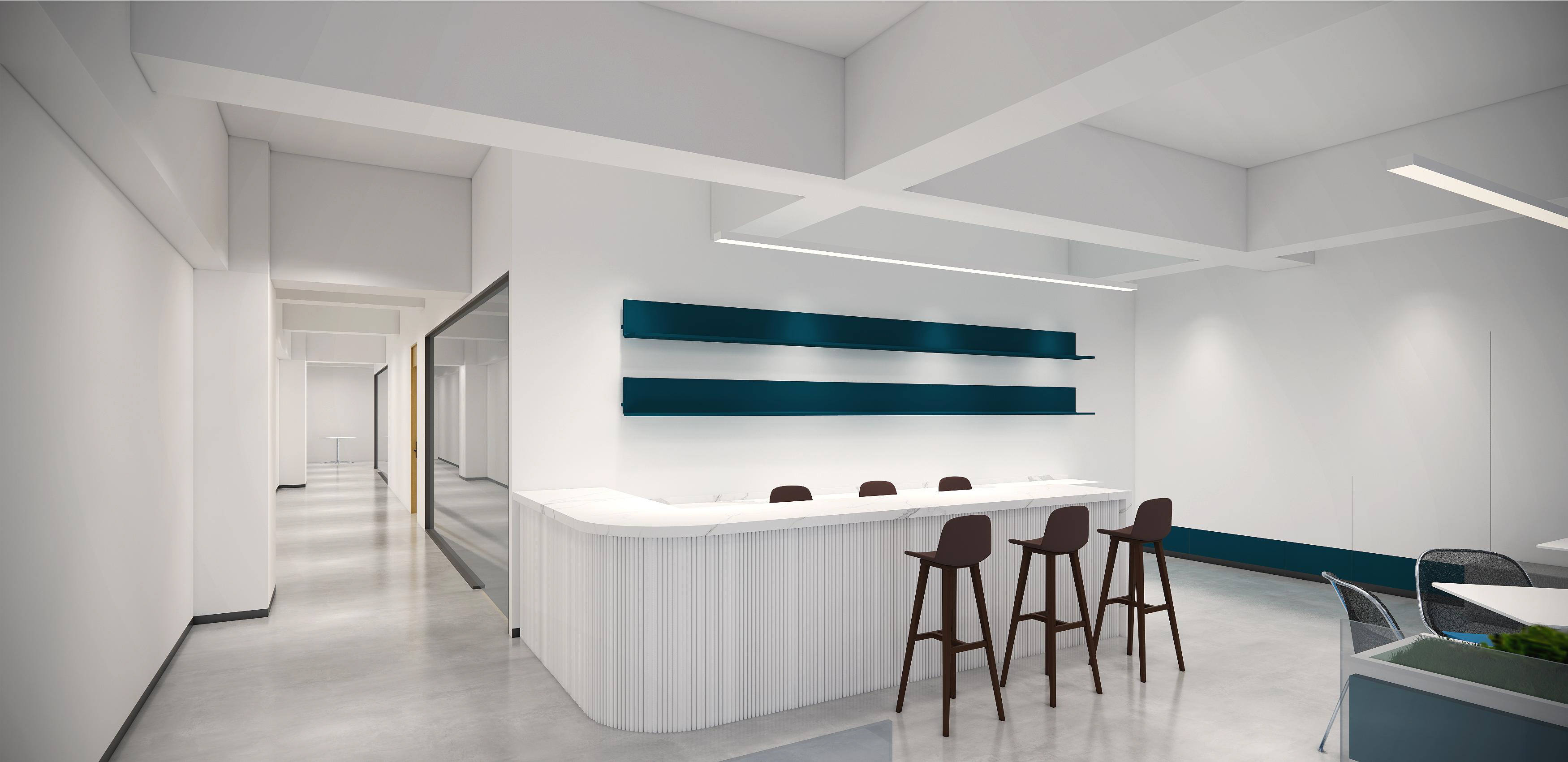 墻面幾何線條的使用,突出現(xiàn)代感,同時(shí)增加動(dòng)感。冷色調(diào)墻面強(qiáng)調(diào)科技感,開放式布局,空間更加通透、流動(dòng)。