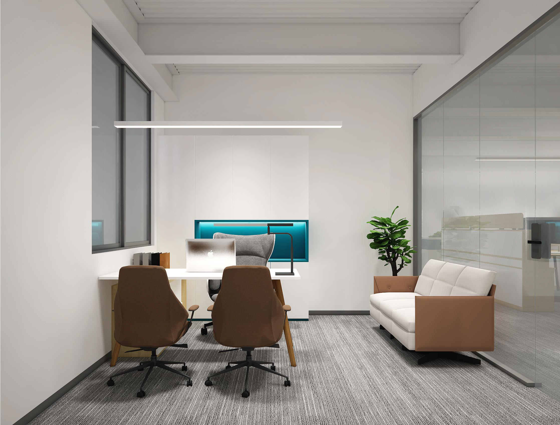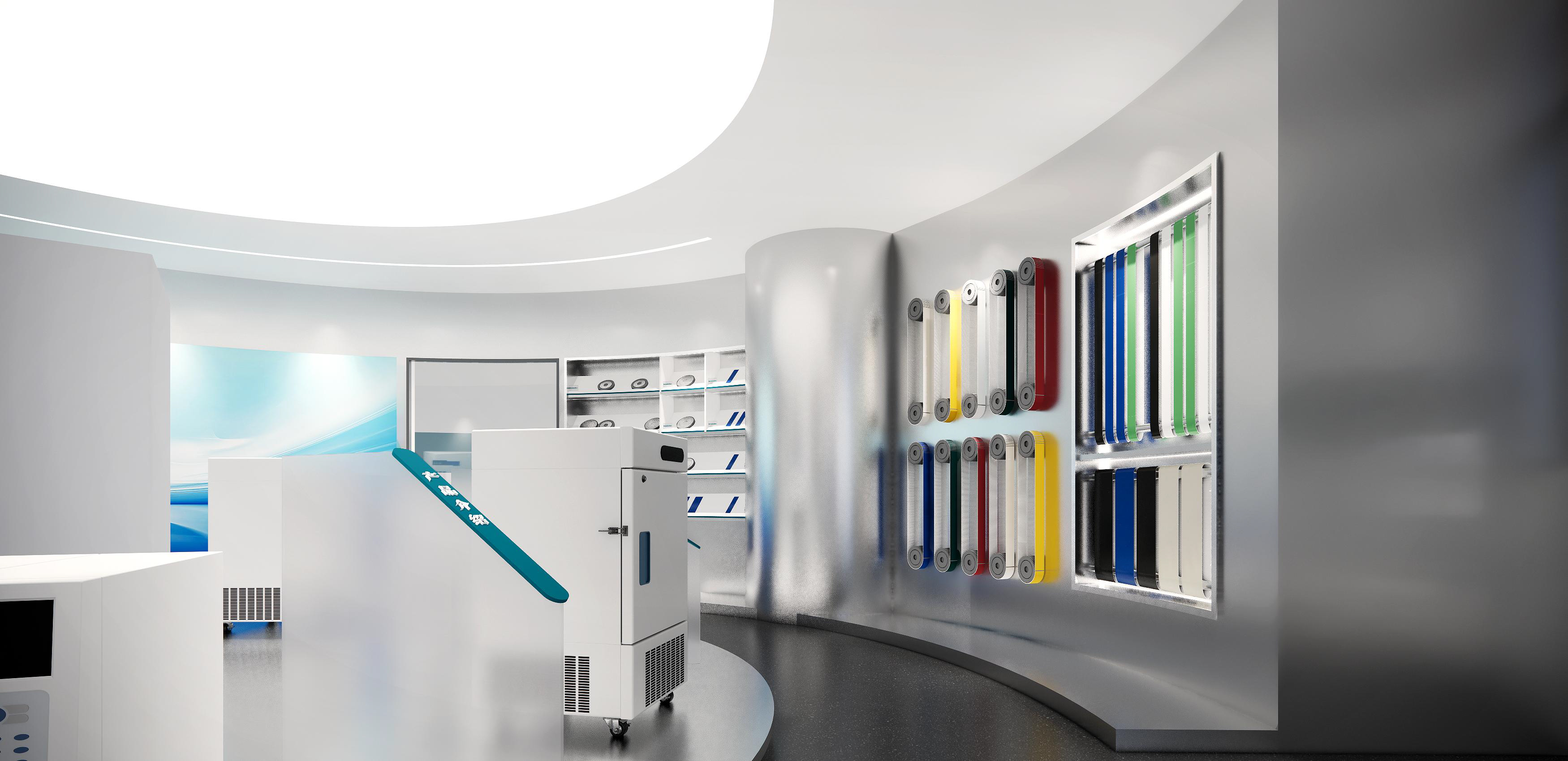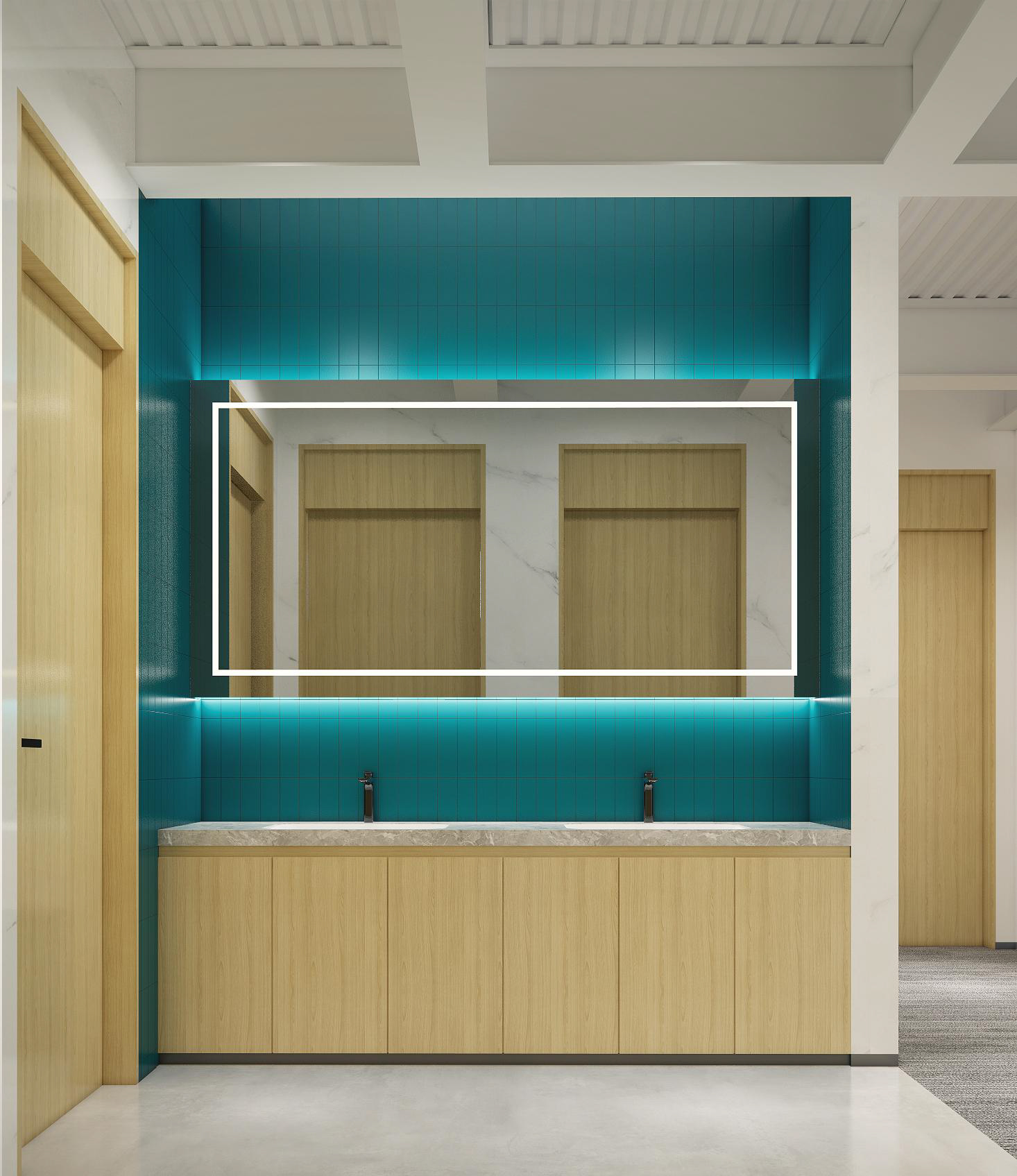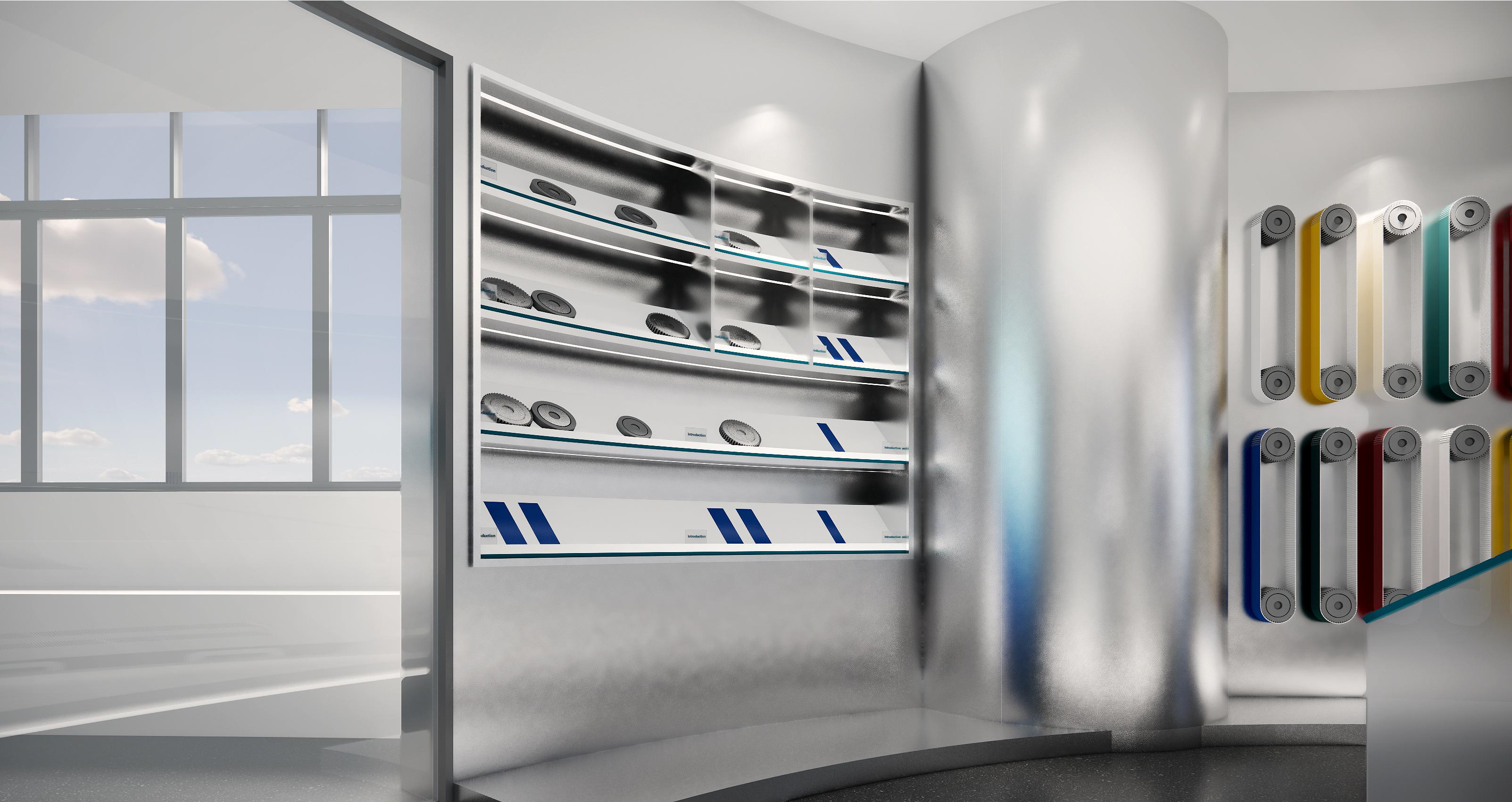 墻面幾何線條的使用,突出現(xiàn)代感,同時(shí)增加動(dòng)感。冷色調(diào)墻面強(qiáng)調(diào)科技感,開放式布局,空間更加通透、流動(dòng)。