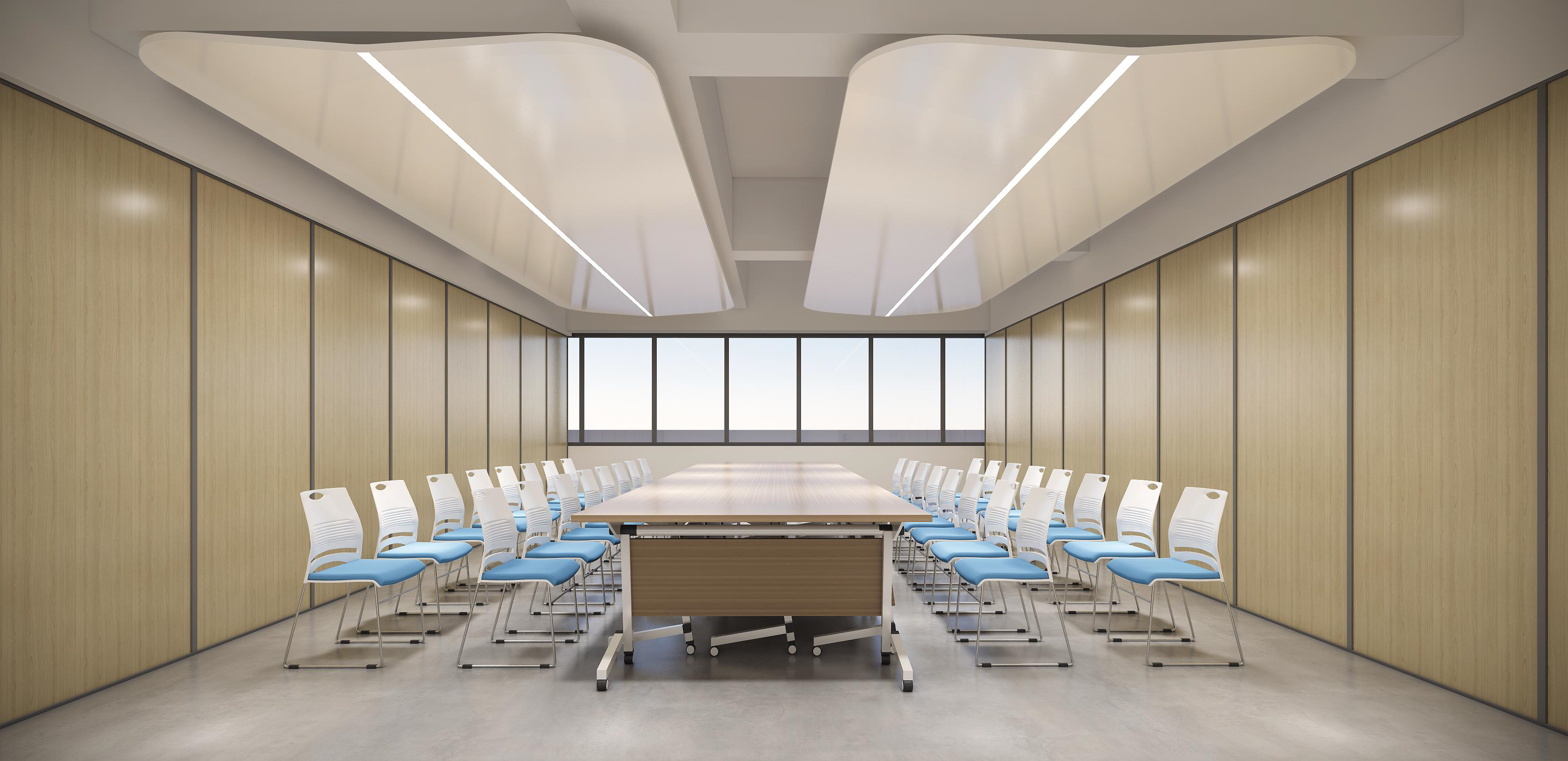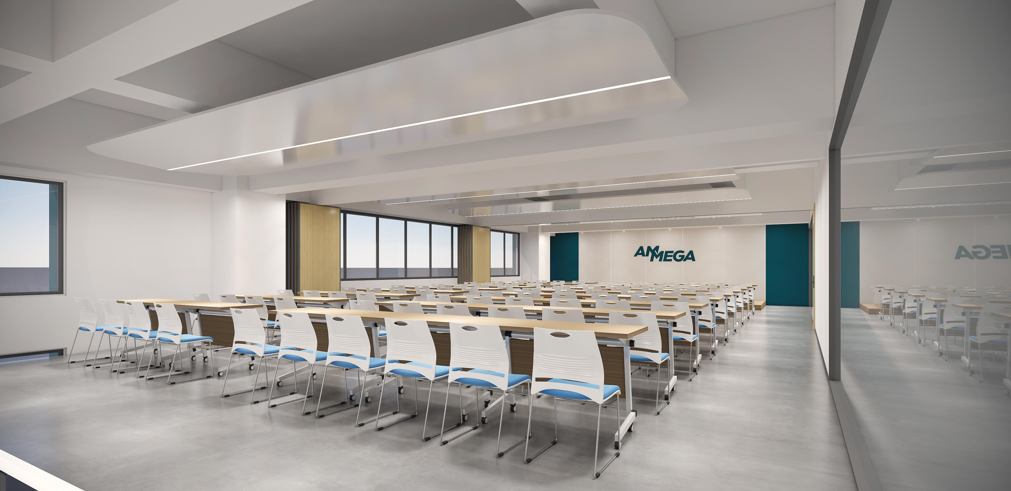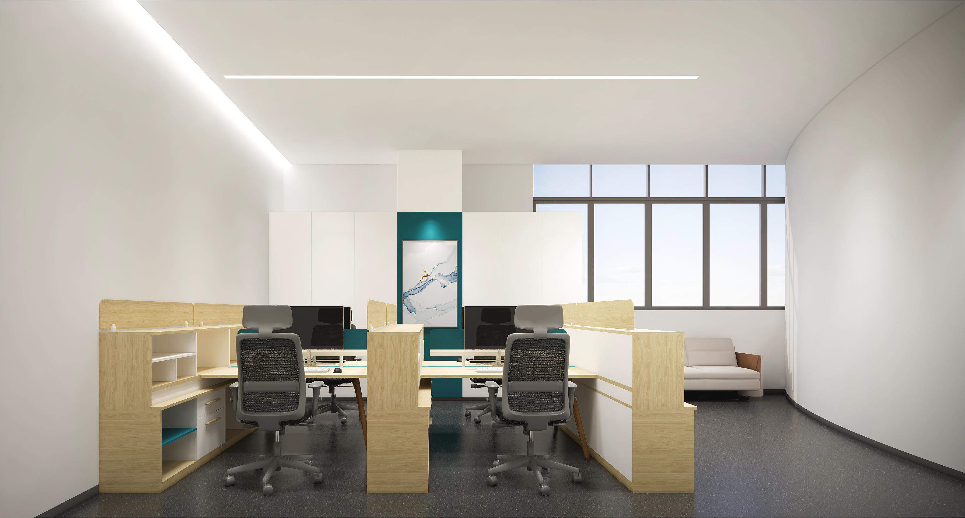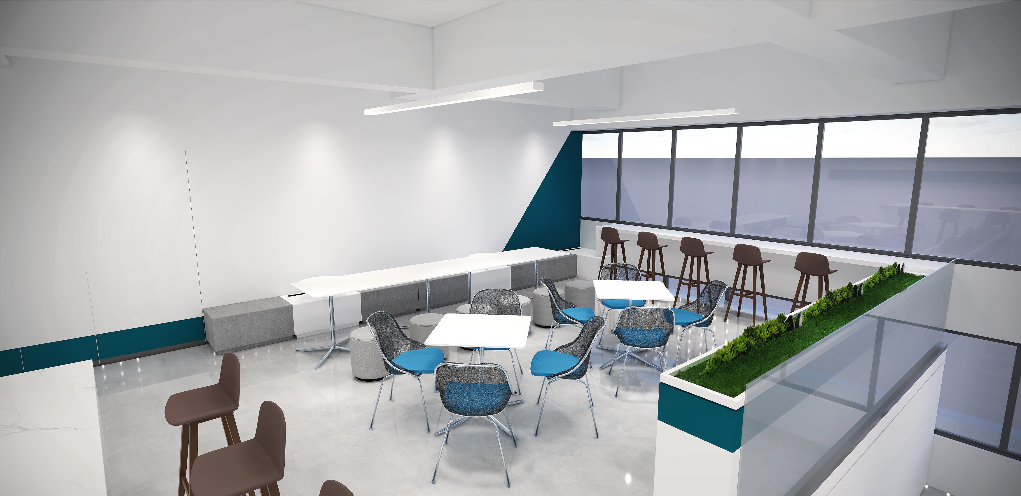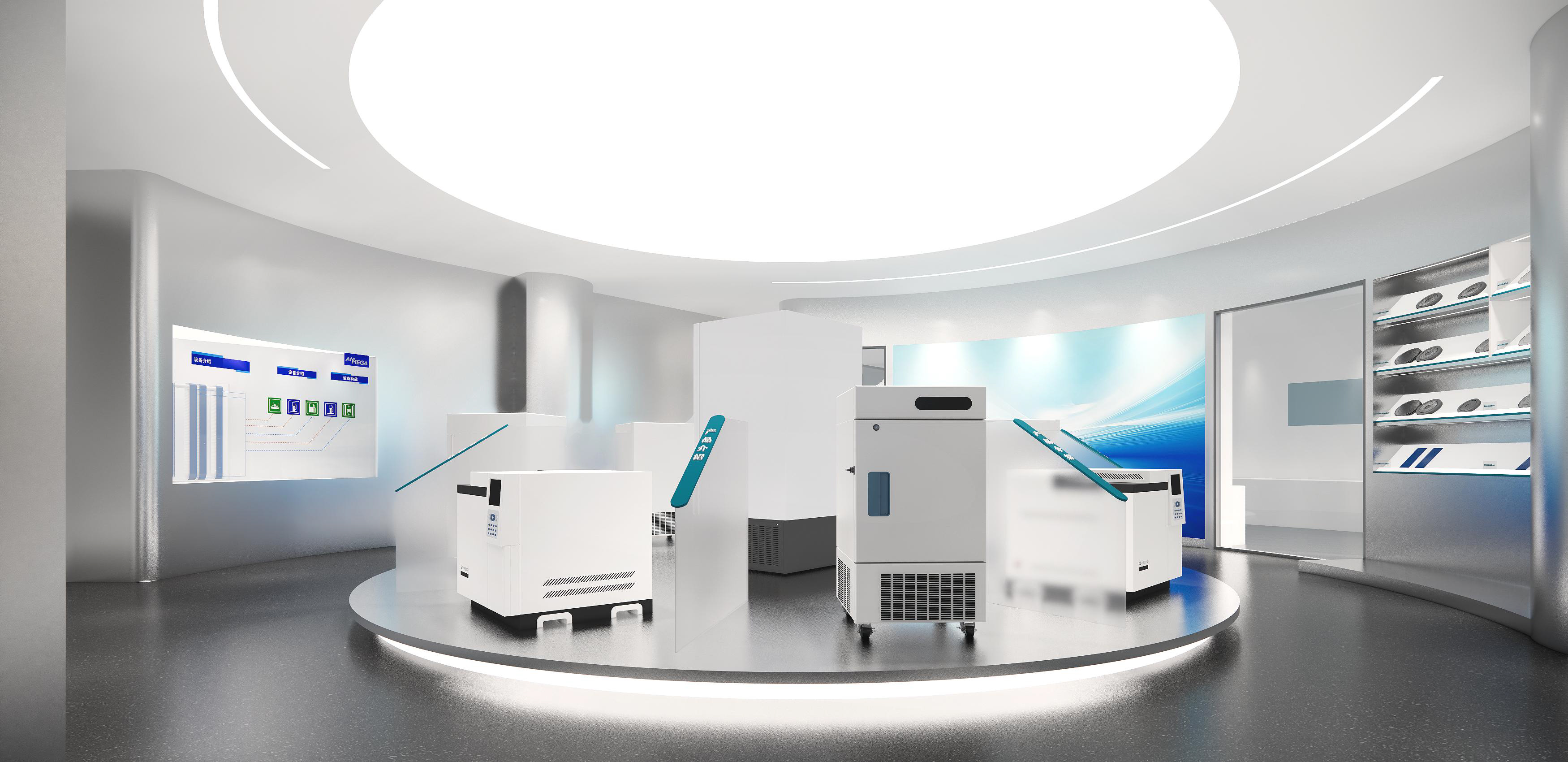 墻面幾何線條的使用,突出現(xiàn)代感,同時(shí)增加動(dòng)感。冷色調(diào)墻面強(qiáng)調(diào)科技感,開放式布局,空間更加通透、流動(dòng)。