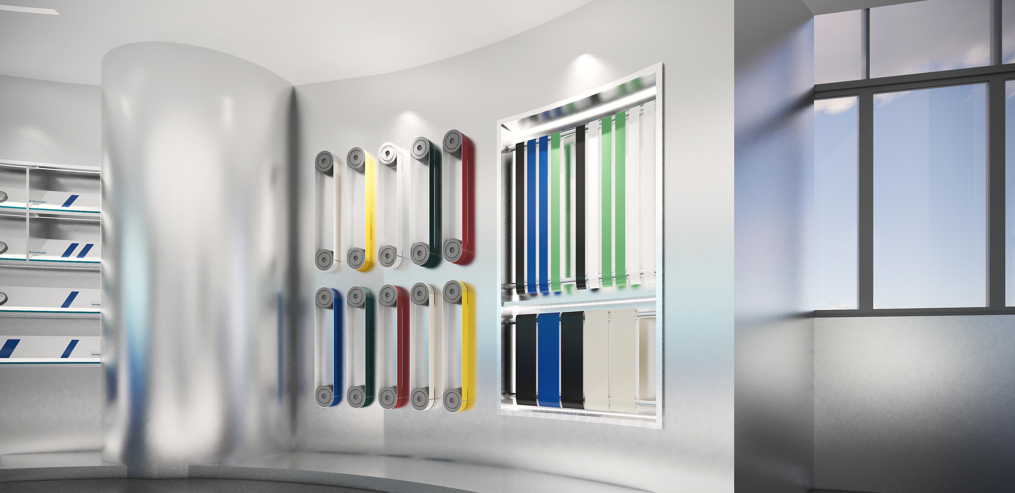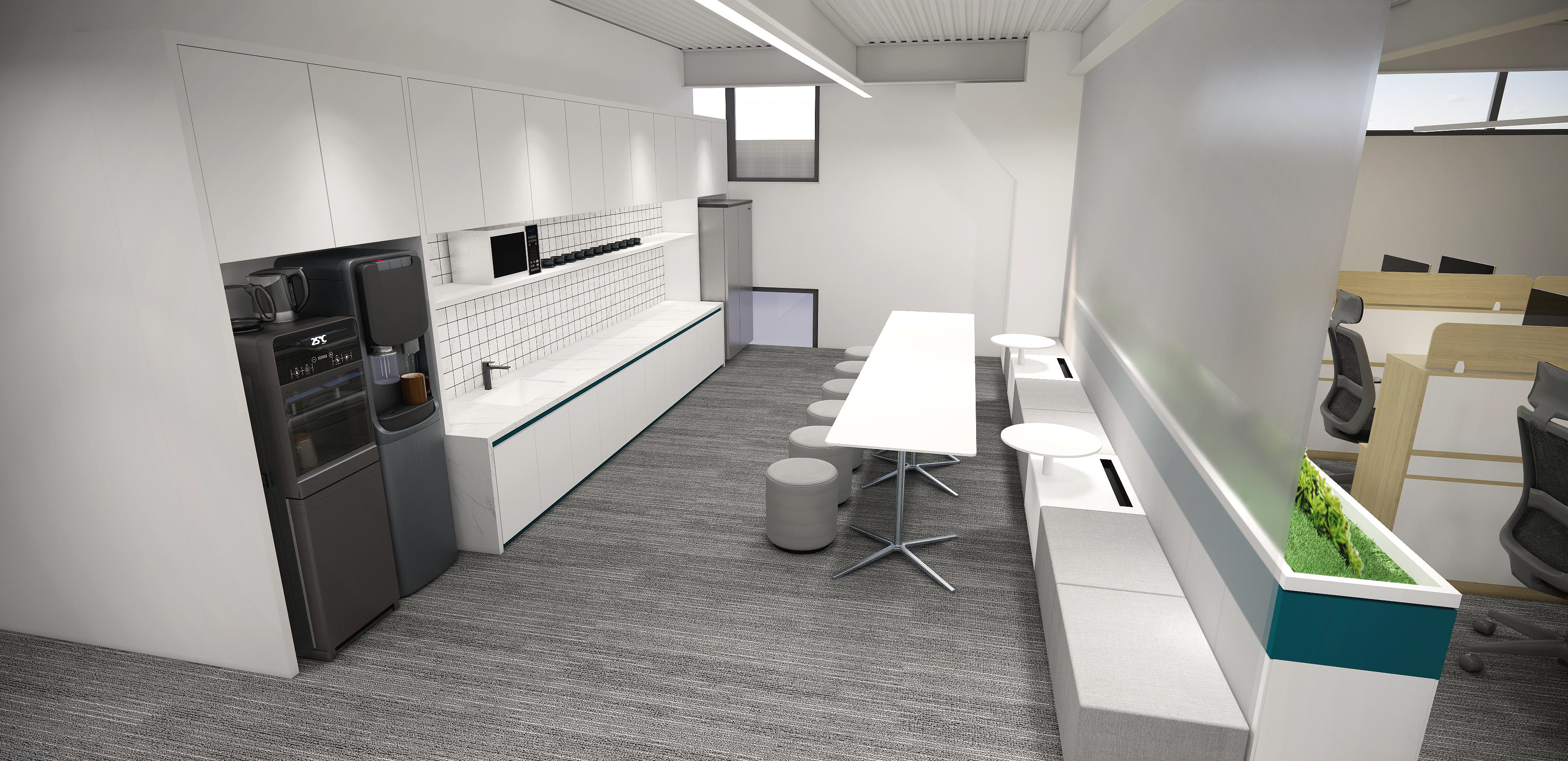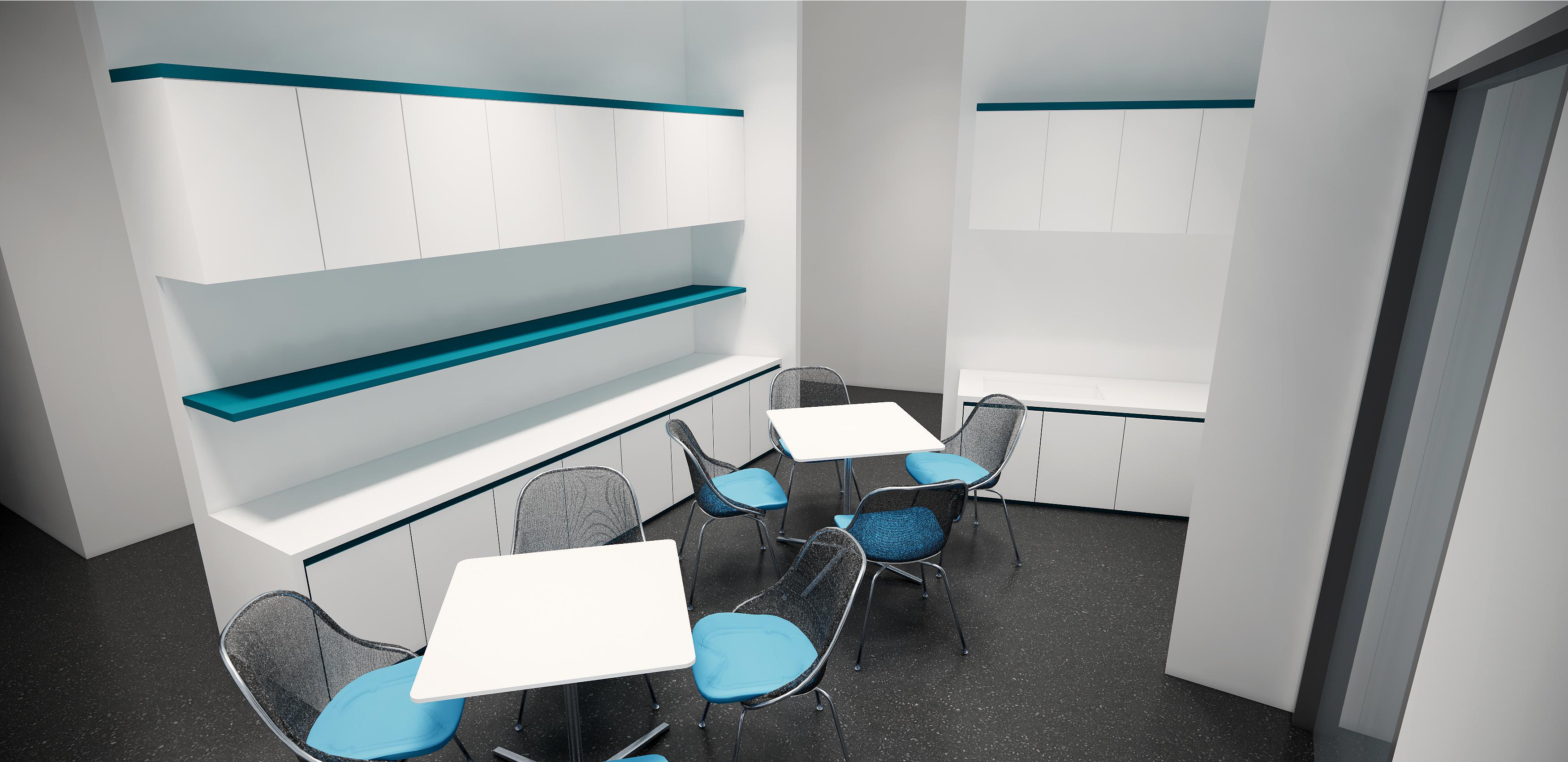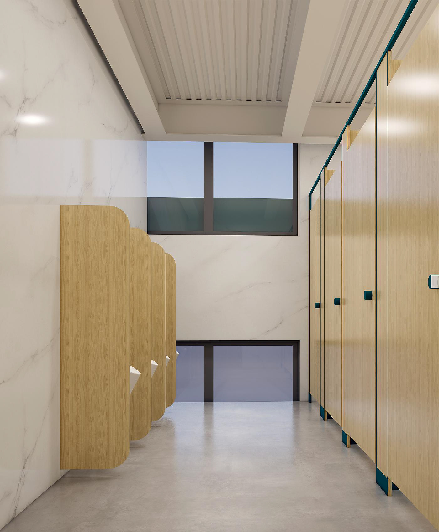 墻面幾何線條的使用,突出現(xiàn)代感,同時(shí)增加動(dòng)感。冷色調(diào)墻面強(qiáng)調(diào)科技感,開放式布局,空間更加通透、流動(dòng)。