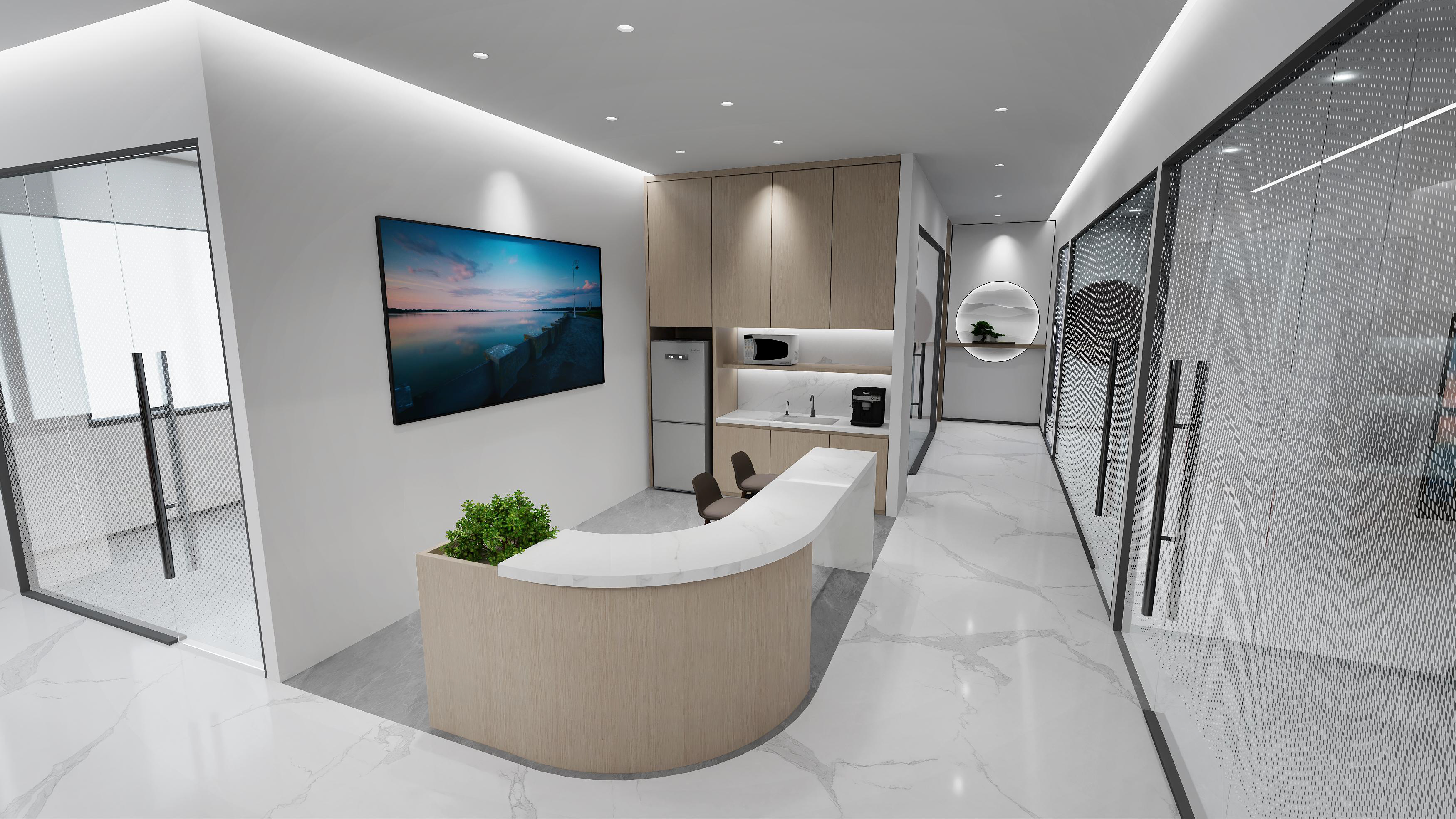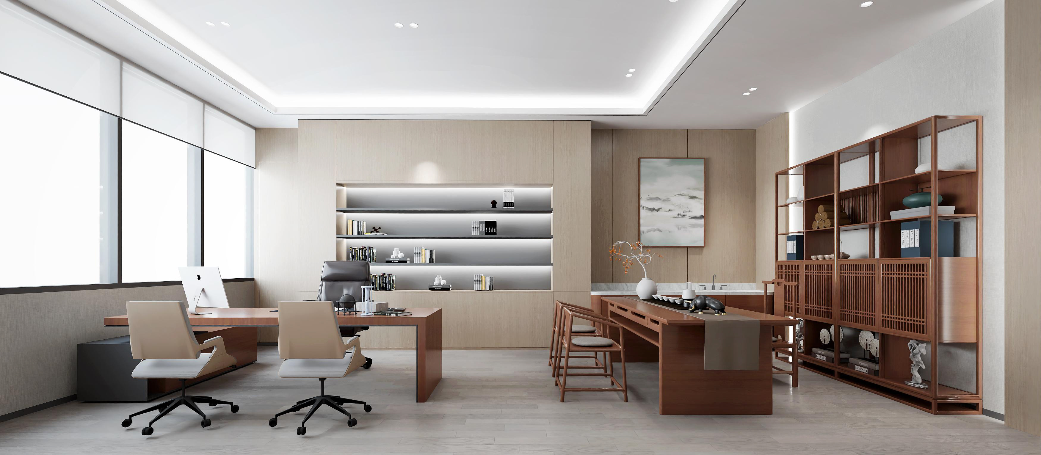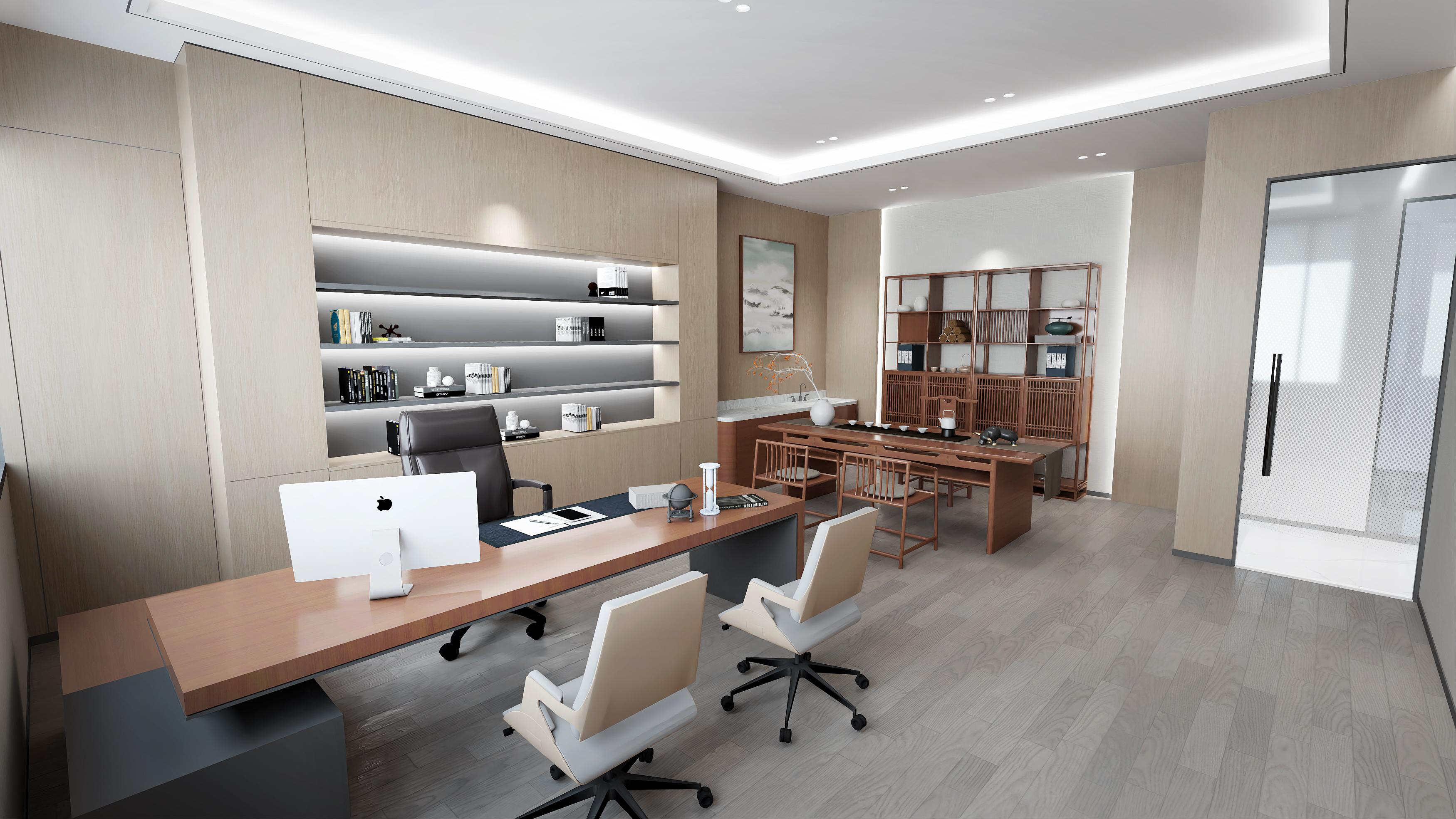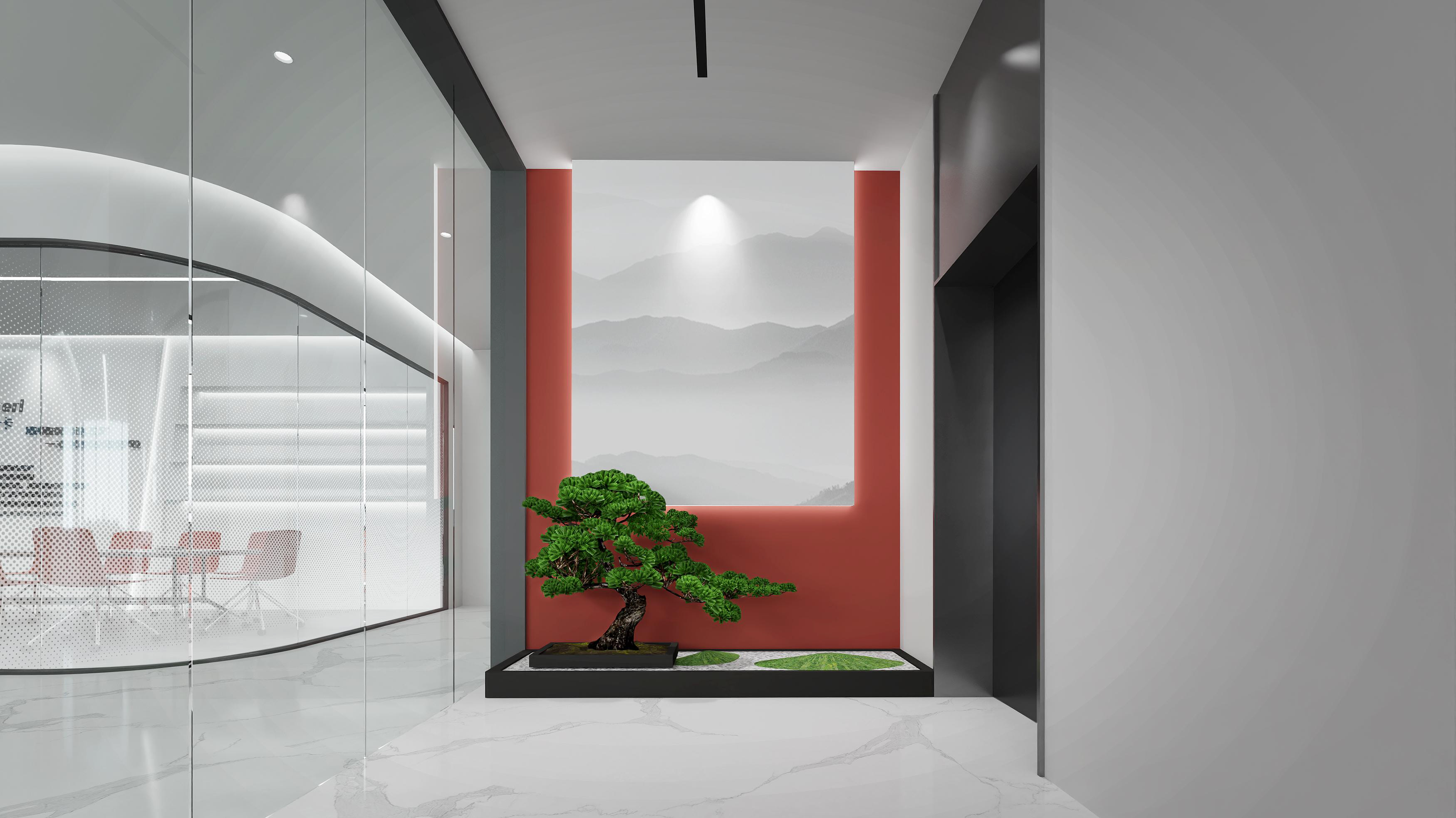 logo墻簡(jiǎn)潔明了,節(jié)省空間,綠植和墻壁相互映襯,沉穩(wěn)大氣。整體以灰色調(diào)為主,打造簡(jiǎn)約風(fēng)格的同時(shí)突出科技感??偨?jīng)理辦公室中式家具以及其他裝飾物的搭配使用,突顯公司品味。