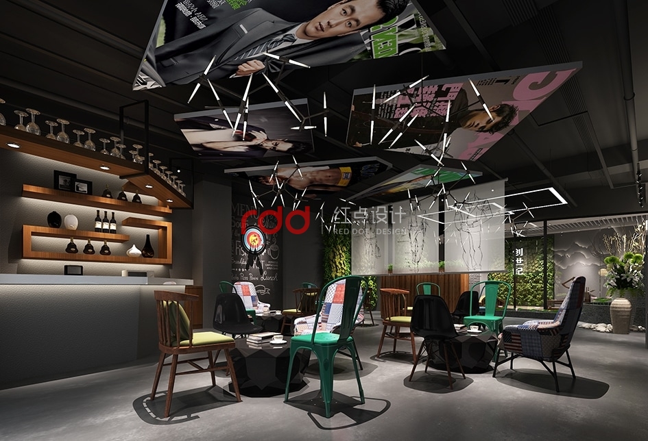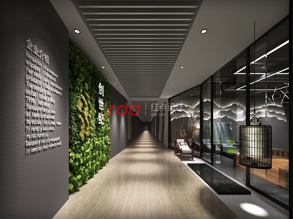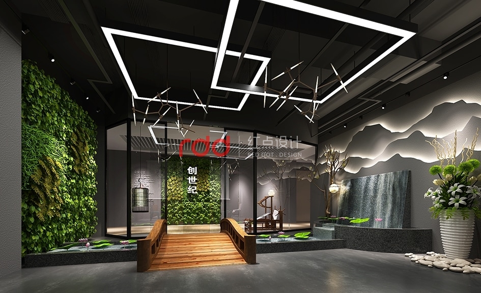 緩緩經(jīng)過走廊,生機(jī)勃勃勃勃的植物墻映在眼前,加上“創(chuàng)世紀(jì)”的LOGO突出醒目,右手邊藝術(shù)椅子及黑色鳥籠中式吊燈給整個(gè)空間增加一點(diǎn)故事性。經(jīng)過木橋,步入前臺(tái)區(qū),一幅如水墨畫般的造型背景墻迎面而來,結(jié)合兩邊的荷花池及人造瀑布效果,仿佛進(jìn)入“小橋流水人家”的感覺。在這樣的環(huán)境下,裸露的深灰色天花吊頂及金屬質(zhì)地的異型燈更引人注目。