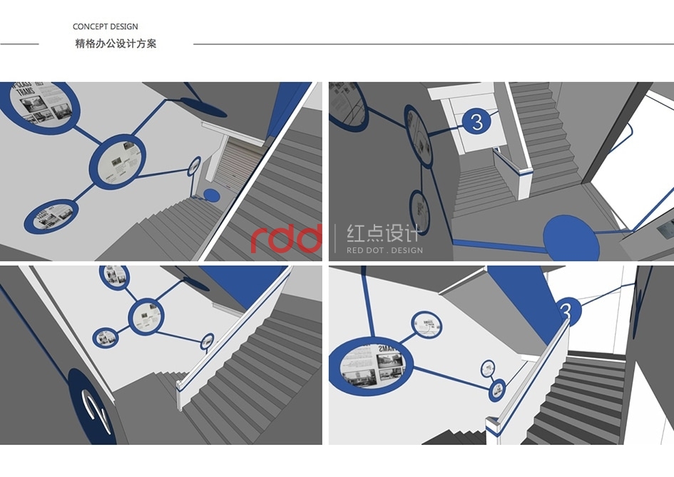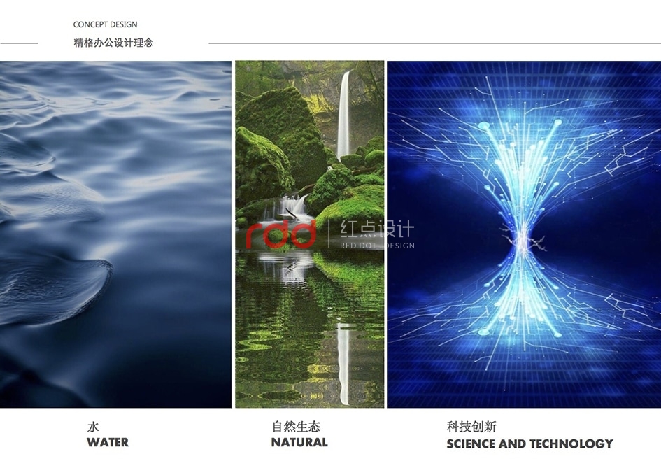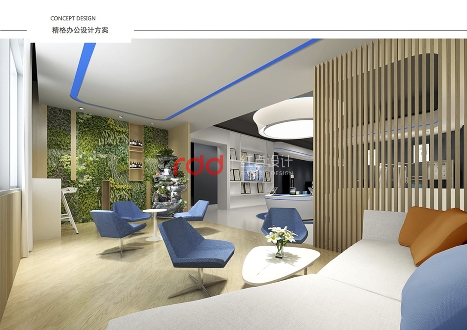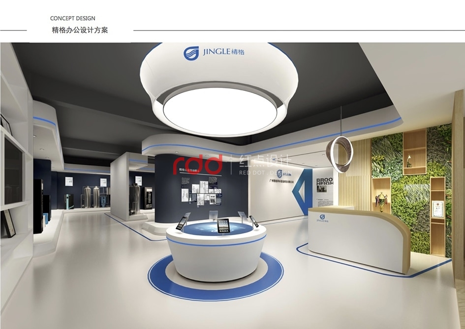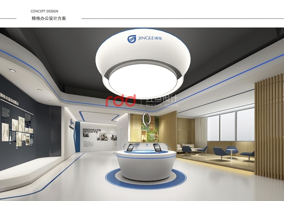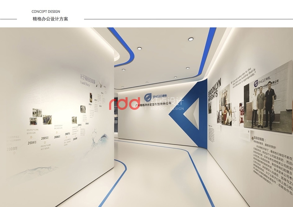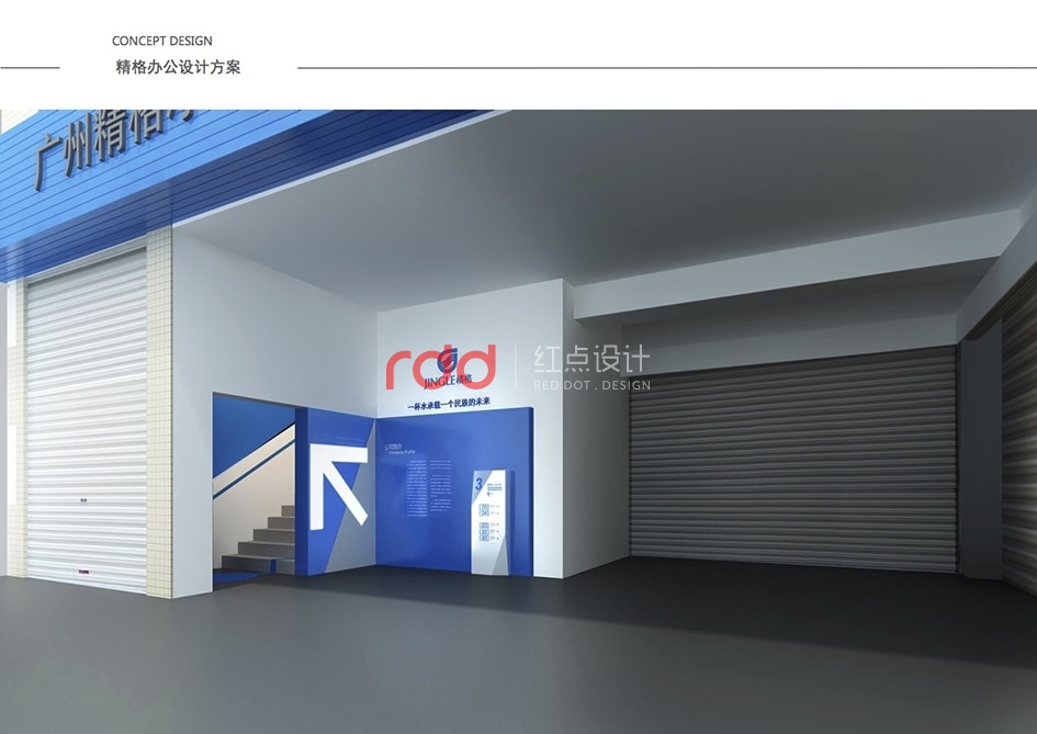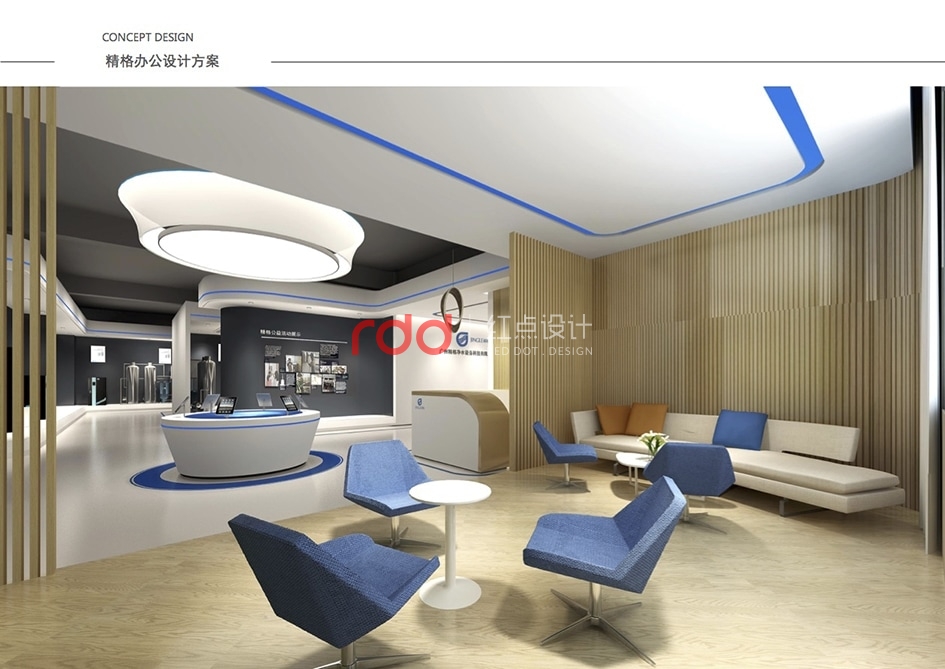 本案是一家凈水設(shè)備公司,因?yàn)槲恢玫年P(guān)系,所以入口有點(diǎn)特殊,因此紅點(diǎn)裝飾的設(shè)計(jì)師為了讓入口處更顯眼,進(jìn)門處運(yùn)用大片藍(lán)色形象背景墻,“精格”的LOGO及“一杯水承載一個(gè)民族的未來(lái)”logo標(biāo)語(yǔ)非常醒目。