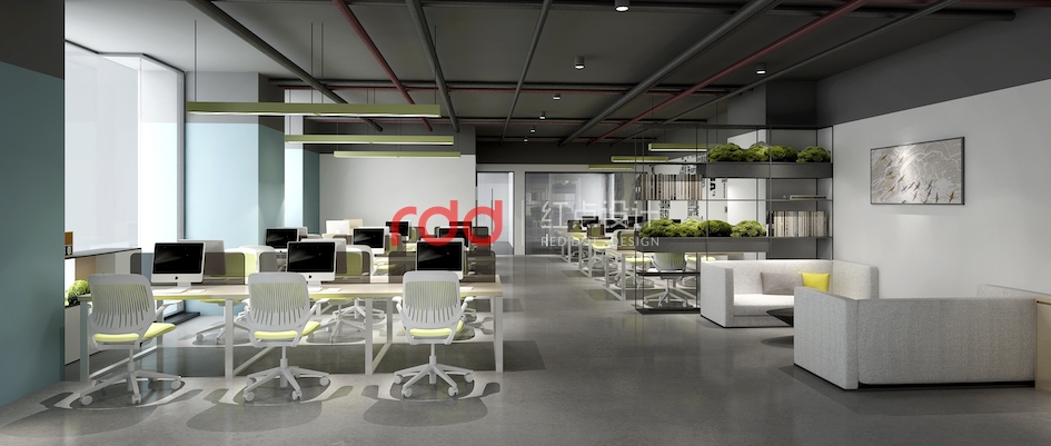 公共辦公區(qū),以淺灰色的地膠為底色,配合嫩綠色及木色的家具,營(yíng)造出輕松的辦公環(huán)境。