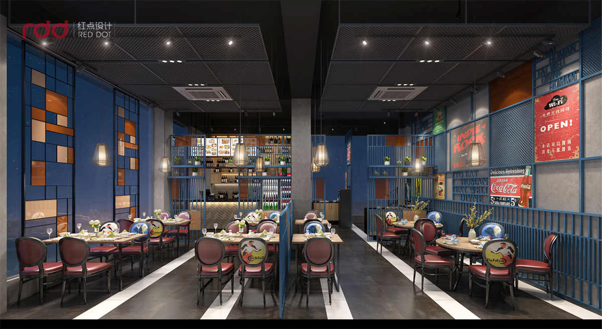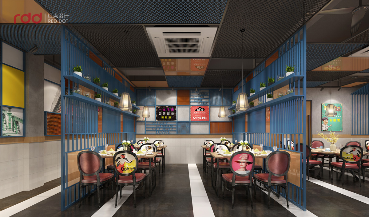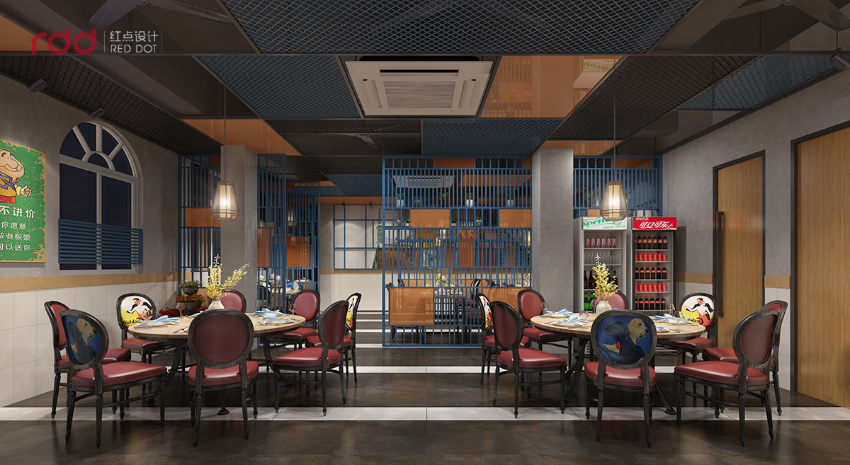 進(jìn)入用餐區(qū),紅黃藍(lán)三種顏色盡收眼底,藍(lán)色的格柵從天花一直延伸到立面,疏密有致的線條既分開了空間區(qū)域又增加了靈動(dòng)性。酒紅色的椅子和淺木色的搭配,添了幾分古典的意味。椅子上、墻上、隔斷上的畫和標(biāo)語,使這個(gè)方正的空間多了一絲幽默感。