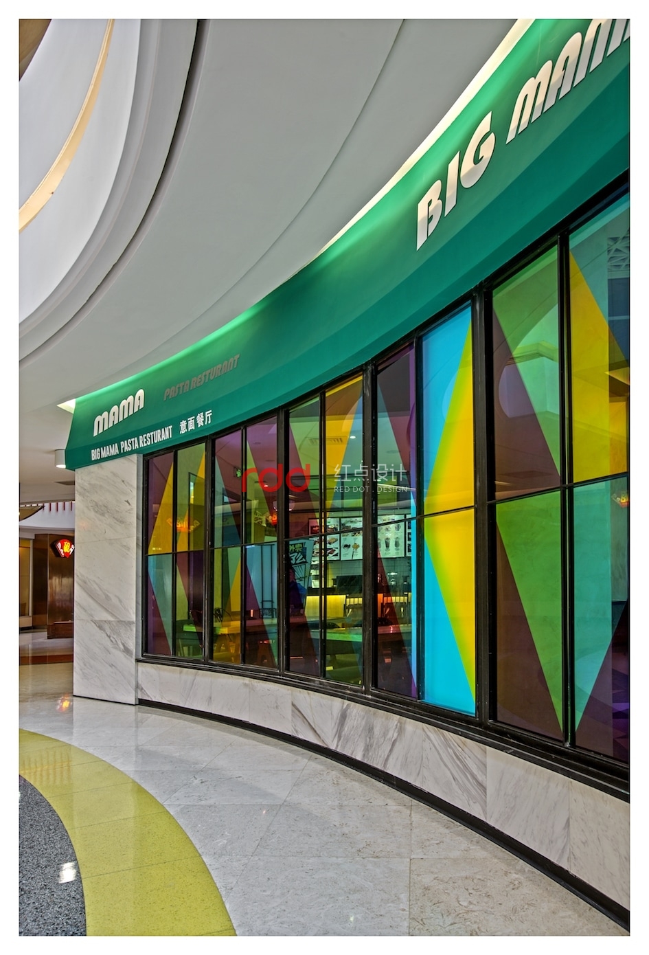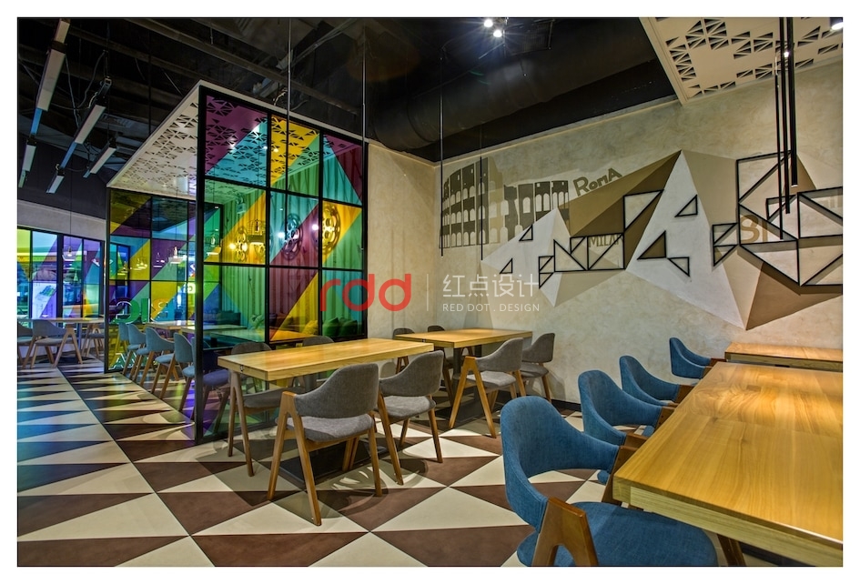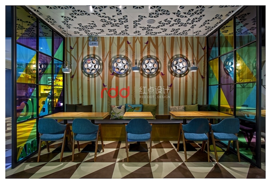 流光溢彩的外立面劃出一道弧線,配上多彩的玻璃窗像極一道炫目的虹。哪怕只是路過,驚鴻一瞥間也能讀出這里洋溢的別致、時(shí)尚與異域風(fēng)情。通透度極高的彩色玻璃,如同眼下時(shí)髦的濾鏡,為空間染上了別樣繽紛。紅黃藍(lán)綠四色被現(xiàn)代主義手法所重構(gòu),隨機(jī)組合成了色彩鮮艷明麗的所在。設(shè)計(jì)師為該餐廳引入了不少電影元素,從門口的老舊放映機(jī)到內(nèi)部的膠卷盤壁燈,復(fù)古的年代感就像大餐中的一小撮海鹽,于時(shí)光交錯(cuò)間,將時(shí)尚與摩登烘托得淋漓盡致。