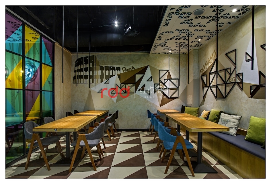 幾何元素被設(shè)計(jì)師大量使用:地板、天花上隨處可見的三角形,既突破了尋??臻g的方正視覺,又將俏皮與活力納入餐廳;壁燈則是別致的電影膠卷盤造型,投影在墻上恍若時(shí)光的印刻;桌面、落地窗則是矩形的代表,將絢麗多彩紛紛框進(jìn)空間,形成井井有條的秩序美感;狹長(zhǎng)的射燈遠(yuǎn)眺仿佛一條條墨線垂天而下,讓空間縱深感十足。不得不令人感慨,設(shè)計(jì)師對(duì)于快時(shí)尚餐飲的拿捏如此到位。