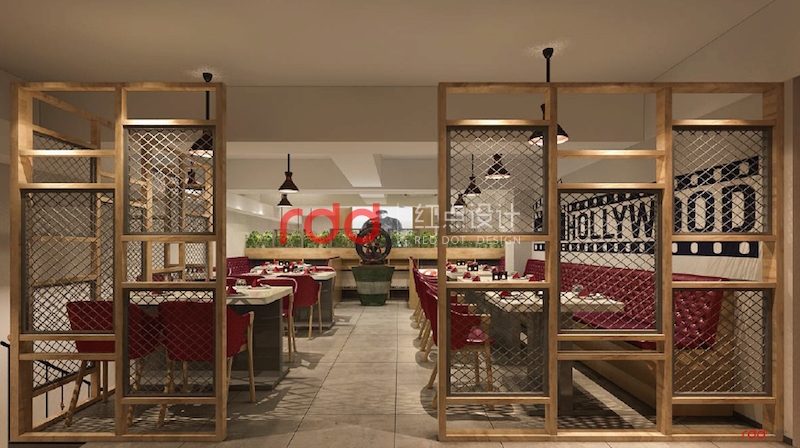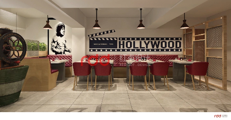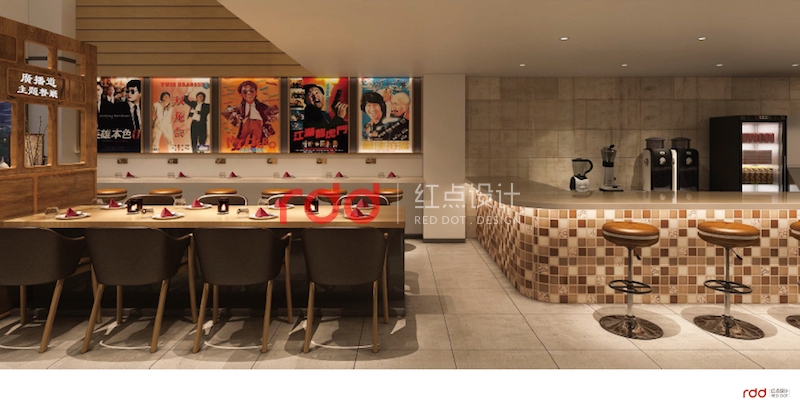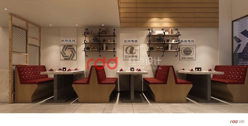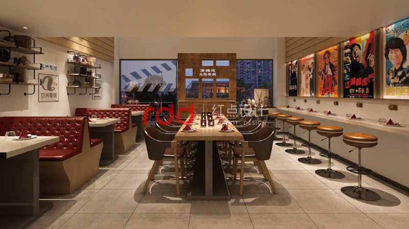 該餐廳的業(yè)主是懷舊電影及電視臺的忠實粉絲,也正是由于喜歡當時年輕時期的美好,懷念當時的感覺。紅點裝飾的設計師根據(jù)業(yè)主的要求,結合設計的需要,利用深木色的家具及當時比較流行的皮質(zhì)拉扣沙發(fā)的家具營造出一種濃濃的懷舊風情。進門兩邊配上經(jīng)典的老式電影及當時轟動一時的電視臺,仿佛徜徉在經(jīng)典電影的影視錄里面。