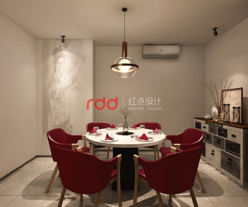 獨立的包間以簡單的白調(diào)配上酒紅色的椅子,在復古吊燈的照射下有一股深沉的味道。