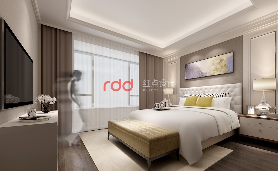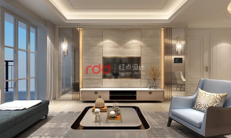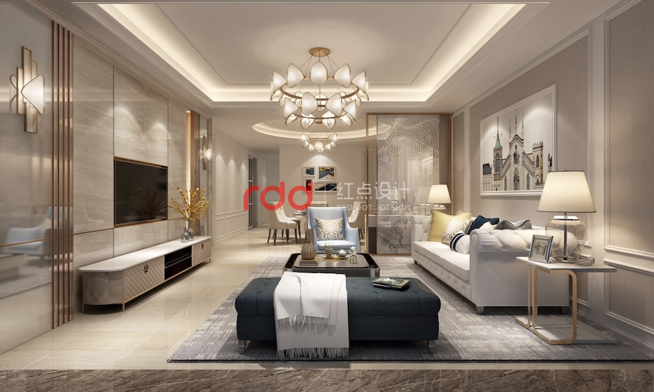 在簡單的住宅空間里,紅點空間設(shè)計的設(shè)計師通過色彩、元素和材質(zhì)的運用將輕奢的簡歐打造得淋漓盡致。