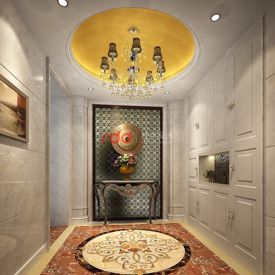 簡歐風(fēng)格是時(shí)下住宅裝修流行的一種風(fēng)格,這種風(fēng)格個(gè)性鮮明,從簡單到復(fù)雜、從整體到局部,精雕細(xì)琢,給人一絲不茍的印象。入戶玄關(guān)白色的整體貴與墻身爵士白大理石形成對(duì)稱互補(bǔ)關(guān)系,簡歐的造型柱典雅大方,中間半透明的歐式花紋背景墻若隱若現(xiàn),內(nèi)噴金箔的圓形吊頂及地面圓形地花互相呼應(yīng)。