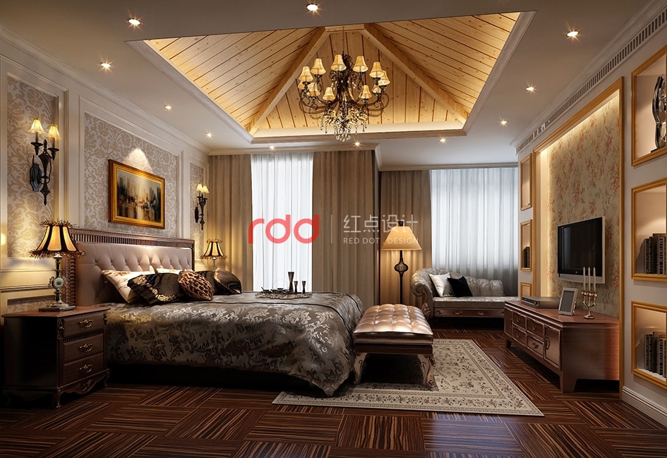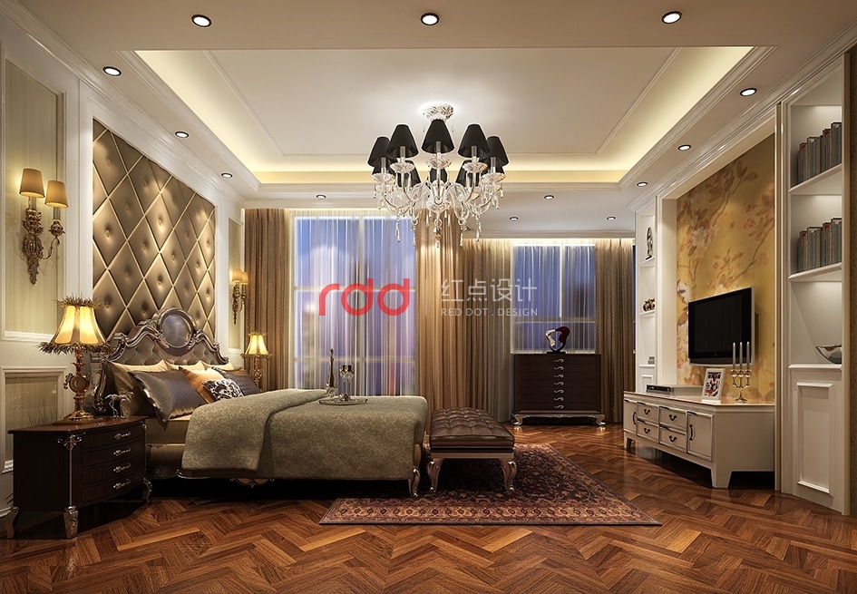 臥室空間內(nèi)歐式花紋背景墻,金漆裝飾線條包邊電視柜,深色的木地板,加上高背軟包的歐式床,在暖光燈的散射下,溫馨舒適。