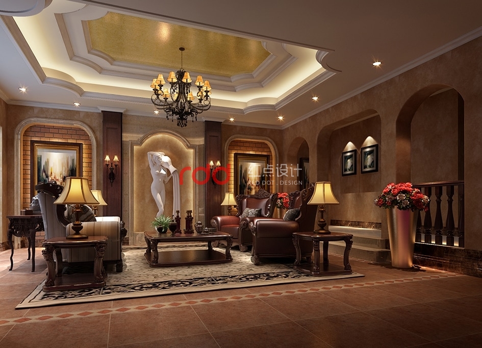 休閑廳有別于整體空間風(fēng)格,以深色的皮質(zhì)家具及深色的復(fù)古地磚為主,配合圓拱門洞,實(shí)木歐式造型欄桿,加上中間背景墻上經(jīng)典的裝飾掛畫及雕塑,輕松舒適的氛圍的顯而易見。