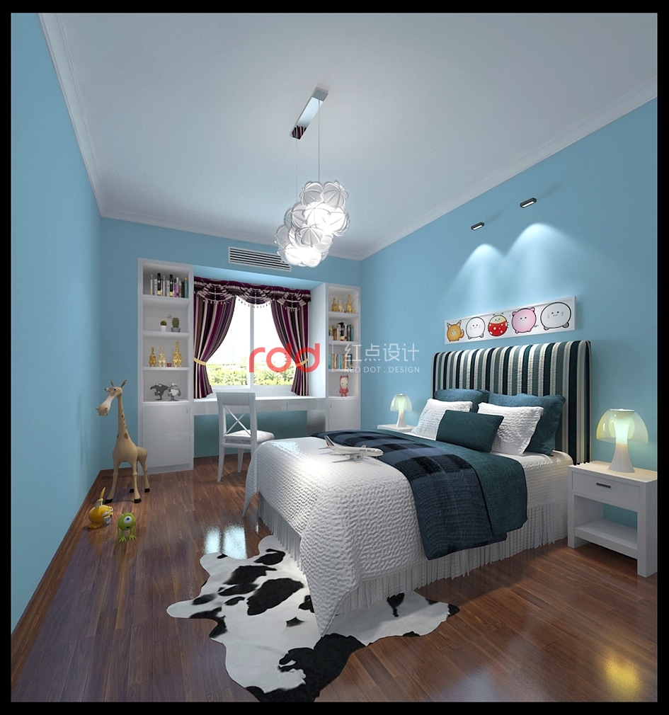 主人房木質(zhì)的床,木質(zhì)的家具及木地板,白色的天花和墻面,哦誒上藍(lán)色的床品及地毯,質(zhì)樸的感覺(jué)仿佛回到了鄉(xiāng)村的休閑生活。兒童房整個(gè)空間被淺藍(lán)色的墻面包圍,是的空間顯得更加開(kāi)闊。藍(lán)色條紋高背床加上白色的床品讓整個(gè)空間的明亮度提高,給人以輕快明亮的感覺(jué),使空間整體活潑感提高。加上白色床頭柜,小巧的天使臺(tái)燈,再配上一個(gè)必不可少的兩門(mén)小衣柜和學(xué)習(xí)桌,使得學(xué)習(xí)和生活更加緊湊。