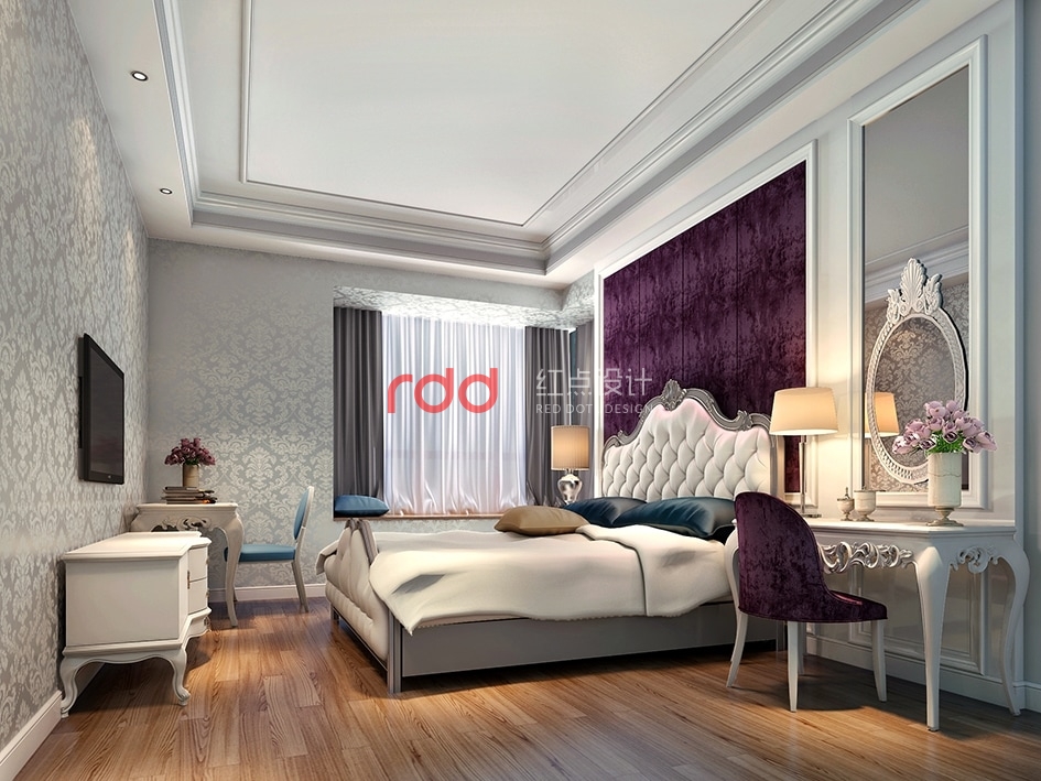 臥室米黃色的墻布,神秘的紫色絨質(zhì)背景墻在柔和的燈光下泛著微光,白色家具優(yōu)雅的造型,細(xì)致的線條和高檔油漆處理,使得每一件產(chǎn)品像優(yōu)雅成熟的中年女子含蓄溫婉內(nèi)斂而不張揚(yáng),散發(fā)著從容淡雅的生活氣息。