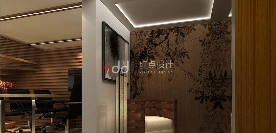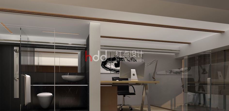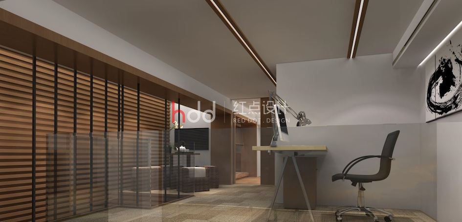 玄關(guān)處以筆墨般線條揮灑于壁面,結(jié)合水墨畫作及編織單椅,創(chuàng)造和風(fēng)意象的端景視覺。辦公室的空間里,白色調(diào)天花板與壁面結(jié)合木紋質(zhì)材的妝點(diǎn),感染溫暖氣息的同時,又不失風(fēng)雅氣度;天花板利用木作描繪出溝縫造型,兩側(cè)壁面則以隔柵線條鋪敘,縱橫的視覺延伸中,拉闊空間尺度;掌握梯下的畸零空間,借由植栽與藝術(shù)雕像的擺設(shè),形塑雅致的人文意象。樓上空間規(guī)劃出浴室、主管辦公室及臥室,借由玻璃材質(zhì)作為隔間,透視感的技法替整體空間營造出開放、流動氣息;延續(xù)一樓的大地用色與自然材質(zhì),利用禪風(fēng)意象的端景與水墨畫作的妝點(diǎn),型塑細(xì)膩的日系風(fēng)范。
