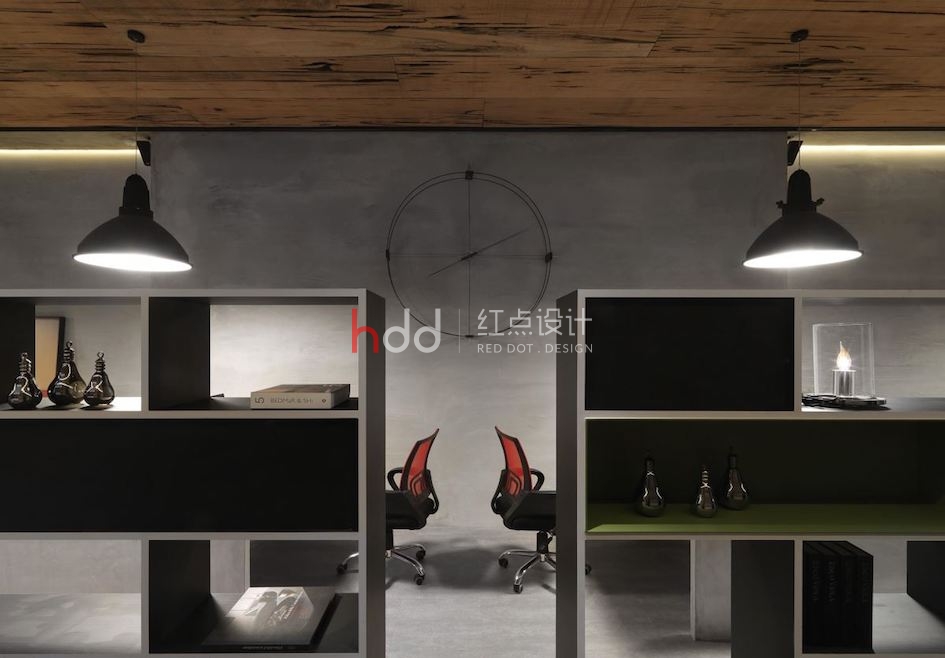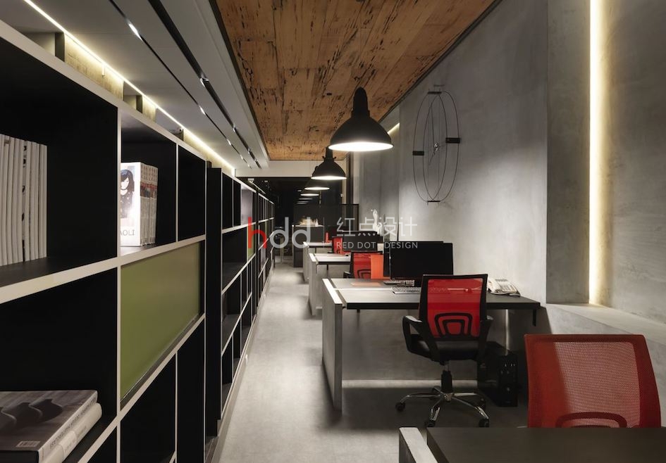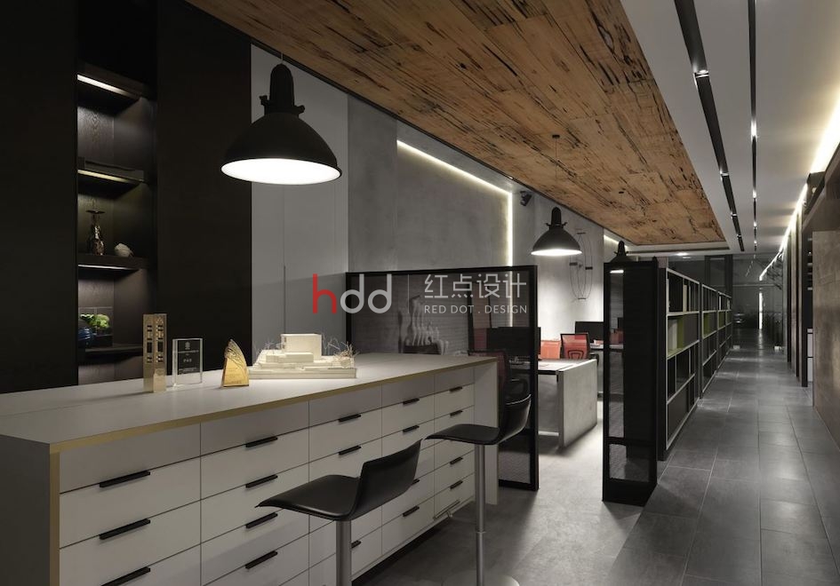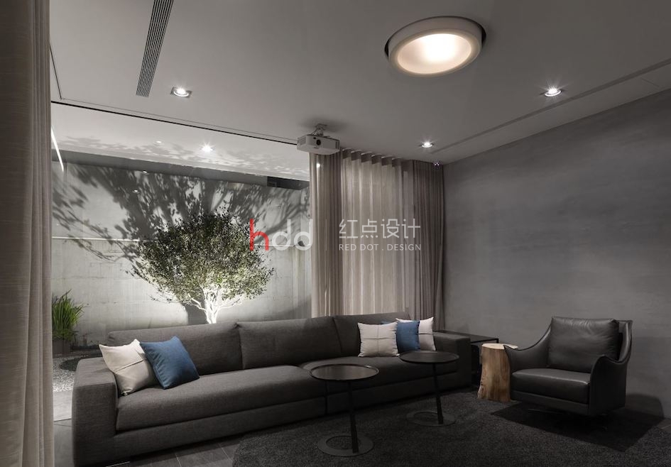 庭院外的一株單子蒲桃樹,無疑是整體一大視覺焦點,設計師加入投射燈,將樹影映照于高樓水泥墻上,展現(xiàn)迷人的搖曳光氛,即便是身處室內沙發(fā)區(qū),也可借由窗戶望見搖曳扶疏的綠景與光影,締造有如畫一般的夢幻視角;辦公室空間中,則運用長型的量體延伸,導引廊道動線,搭配天花上方的極細燈帶,展現(xiàn)帶有工業(yè)風格的陽剛之美,同時借著開放式的柜體造型,使場域與場域之間充滿視線互動,紅色的辦公椅與綠色柜面更形成反差對比,帶出色調的活潑趣味性!辦公室內安排一座休息吧臺,位處于空間的前端,正巧可收進大門外景致,使工作同仁可在此覓得視覺與身心的放松!