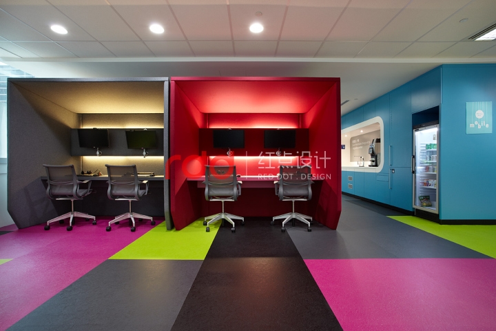 當(dāng)你走出升降機(jī)門廊,就如同開始了一段趣味之旅,帶領(lǐng)參觀者進(jìn)入一個(gè)頗具吸引力的主接待處。開放概念設(shè)計(jì)的等候區(qū)內(nèi)的咖啡角歡迎每一位到訪者?!癇uzzi Booths” 擴(kuò)展在1600平方米的辦公室空間內(nèi),為那些在工作時(shí)需要獨(dú)處的人提供空間,為合作交流者自由討論和工作團(tuán)隊(duì)內(nèi)部的頭腦風(fēng)暴提供了會(huì)面地點(diǎn)。
