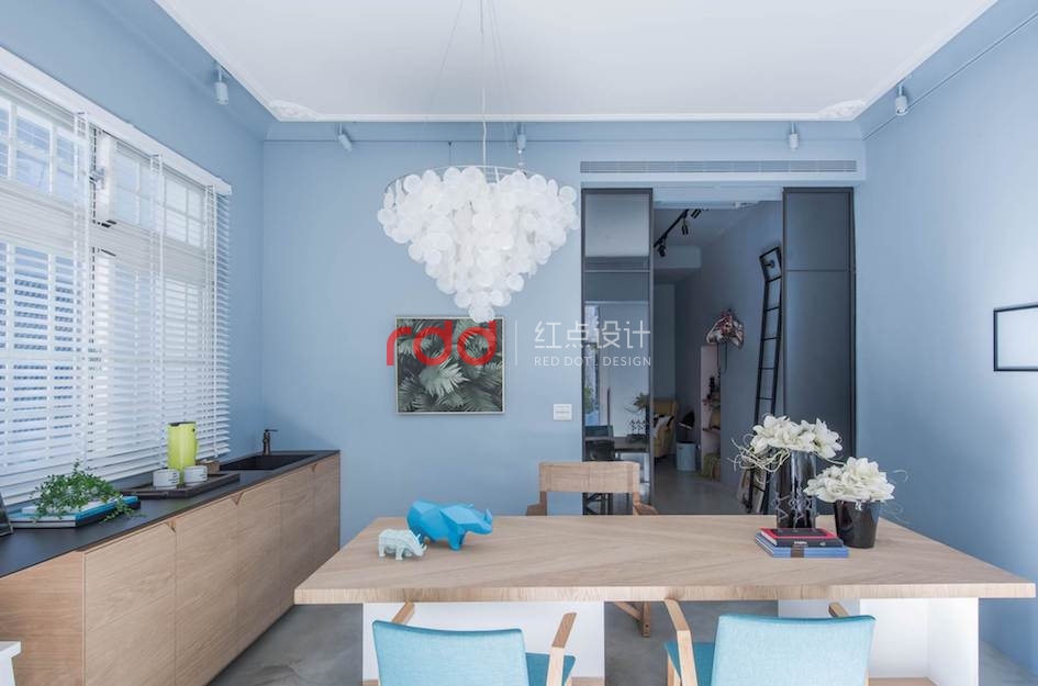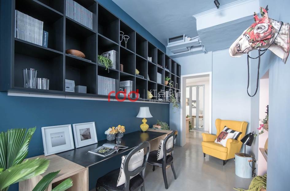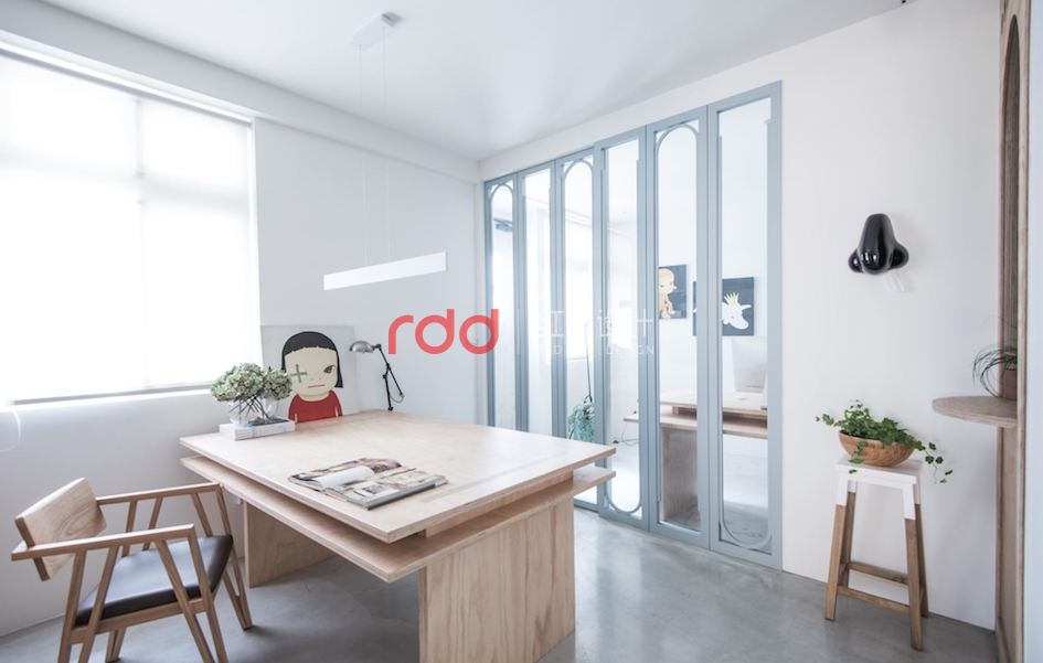 辦公室一定枯燥又無聊嗎?這個既清新,又洋溢著滿滿舒適感的辦公室設計,絕對會改變你的想法!這次小編要帶你一起來看看設計師的靈感發(fā)源地吧! 由老屋翻新的設計師辦公室,因為房屋格局偏長型,讓中段區(qū)域缺乏光線,因此大門處及后方的空間借由玻璃材質增強光線的穿透性,并采用清新的淺色實木、溫和而舒適的灰藍色調,營造了休閑放松的工作氛圍。入口處的拼接花磚延續(xù)至室內,形成了向內延續(xù)的動態(tài)效果,斜向的切線分割,也讓空間更加俐落而明快。除了工作區(qū)外,也另外擺設了一張鮮亮的黃色沙發(fā),成為了室內的活潑亮點,同時也是舒適的閱讀區(qū),提供設計工作者更加放松的閱讀情境。