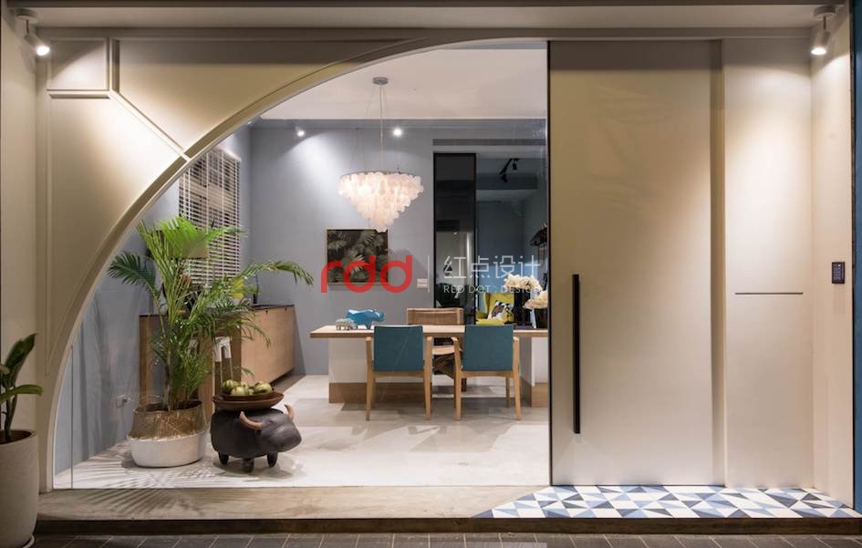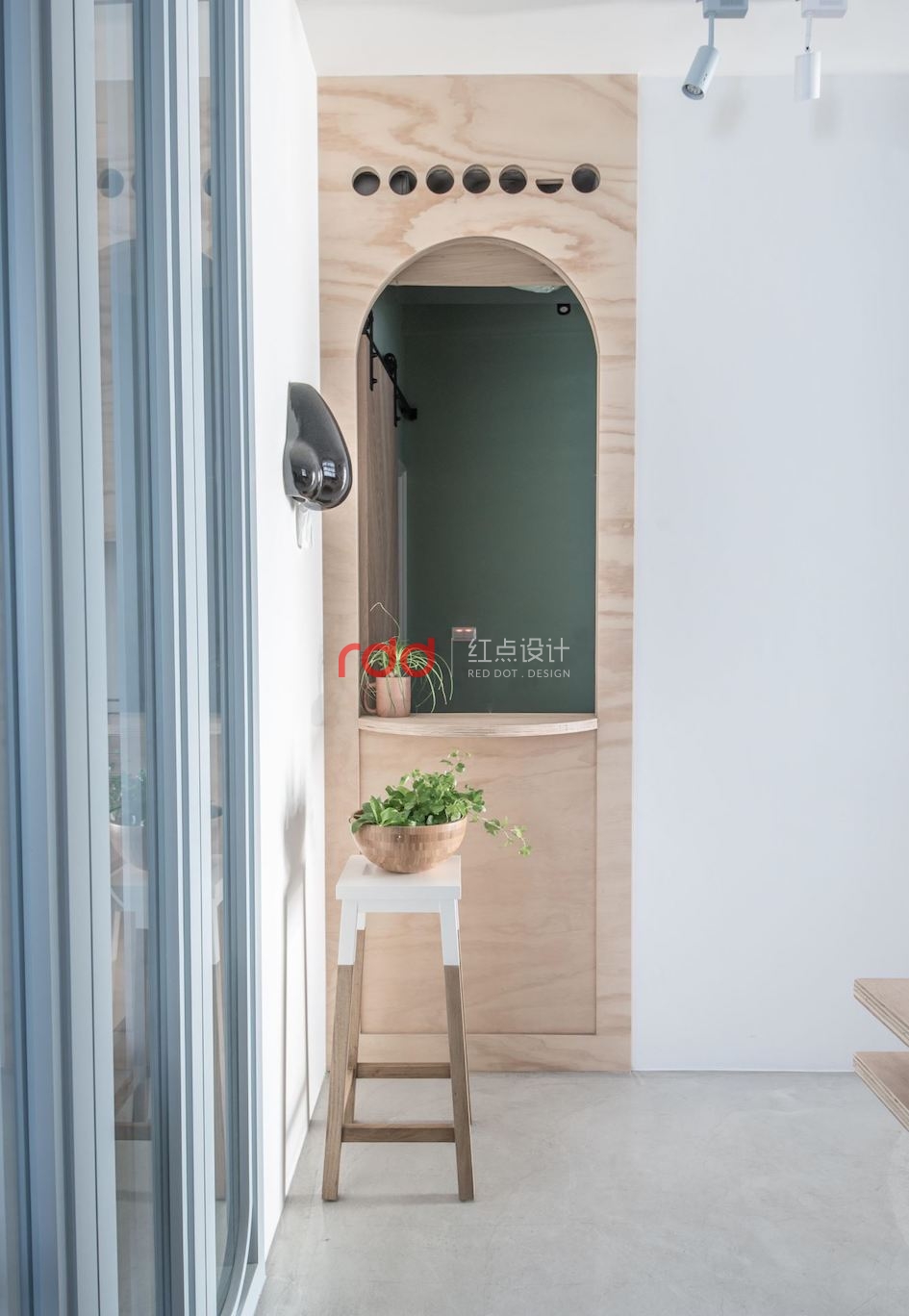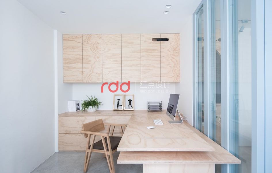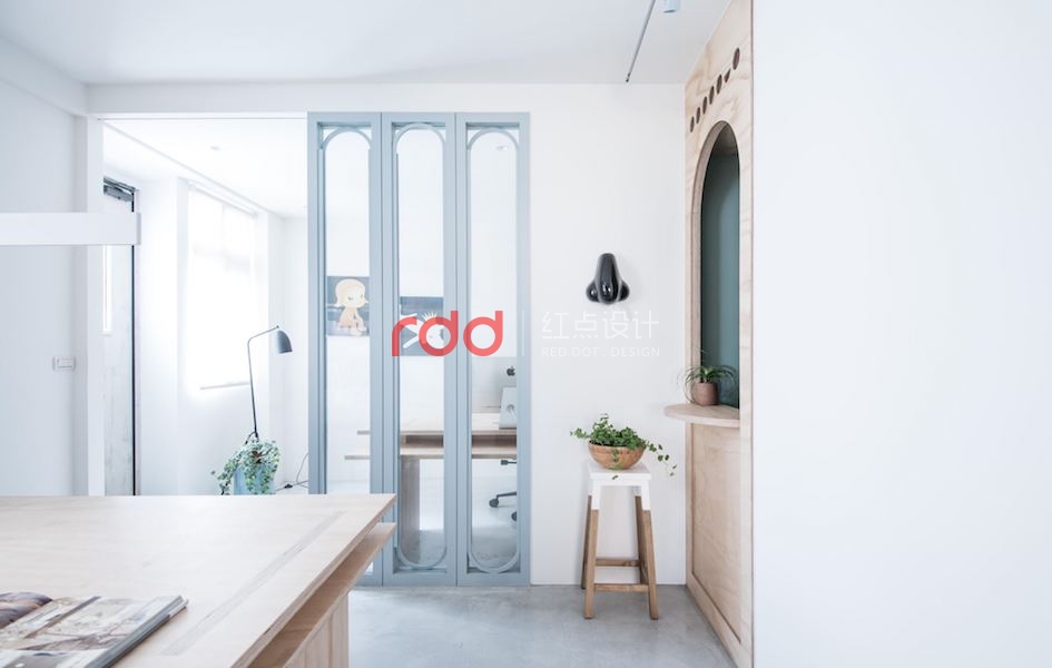 改變一般的設計方式,辦公室門口的落地窗設計,融合獨特的圓弧造型,讓室內空間也能成為令人印象深刻的風景。