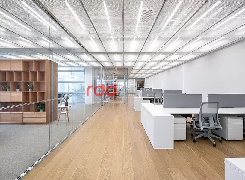 所有辦公室和會(huì)議室均采用雙層超白玻璃隔斷,保證隔音的同時(shí)將自然光和視線(xiàn)交流最大限度引入內(nèi)側(cè)大空間。