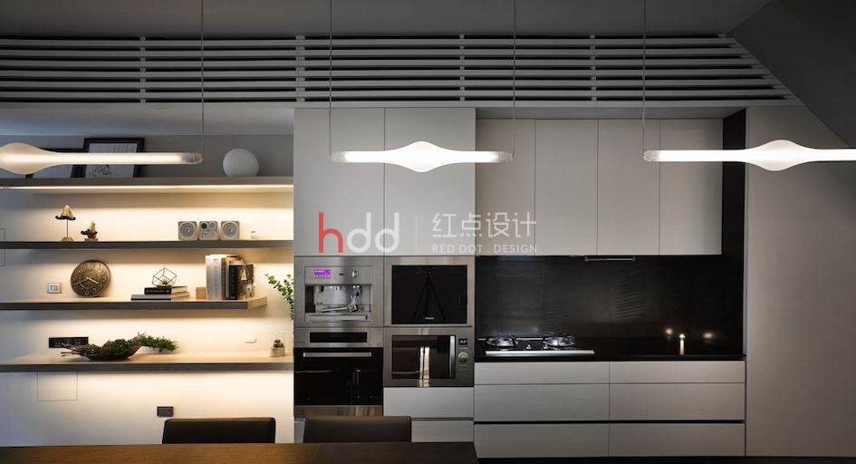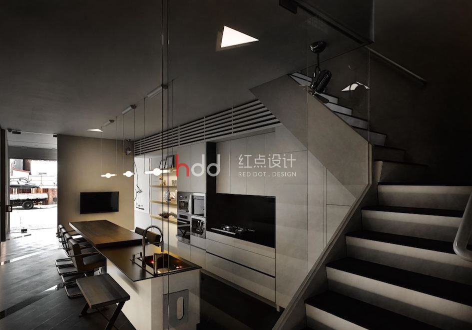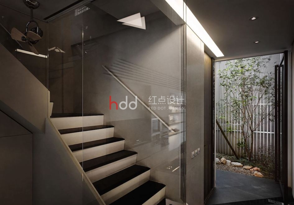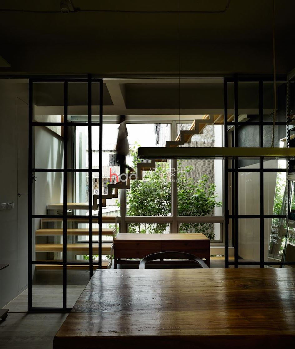 位于一整排房屋中段的透天厝,原本室內(nèi)采光不佳,在設(shè)計(jì)師的改造下,透過前后的落地窗引注陽光,并在后院種植楓香樹,將設(shè)計(jì)辦公室與大自然的溫度嵌合連結(jié),成為讓令人驚艷的社區(qū)地景。 來到這個獨(dú)特設(shè)計(jì)的辦公室,以純白為色彩主調(diào),加入造型鐵件、玻璃等介質(zhì),在有序的工作空間中,將光線的進(jìn)折,醞釀為藝術(shù)般的美好表現(xiàn)。從二樓處向上俯瞰,水泥量體和玻璃的幾何層次,于高挑的立面中虛實(shí)交迭,將樓層間連貫為一座自然光井,除了讓視覺顯得通透,空氣也可借此形成上下對流循環(huán)。通往三樓、四樓的階梯,倚著窗景綠意向上延伸,透過通透的玻璃介質(zhì),將原本封閉的梯間,則轉(zhuǎn)化為開放式的生活風(fēng)景,一年四季為工作空間帶來不同的景致變化,與陽光、綠意、微風(fēng)完美共生。 陽光自透明落地窗透入室內(nèi),仿佛伸手即可觸碰到窗邊的鮮活綠意,而隨著工作中的動態(tài)行走,也串連成一幅在樹梢間自在漫步的浪漫畫面。
