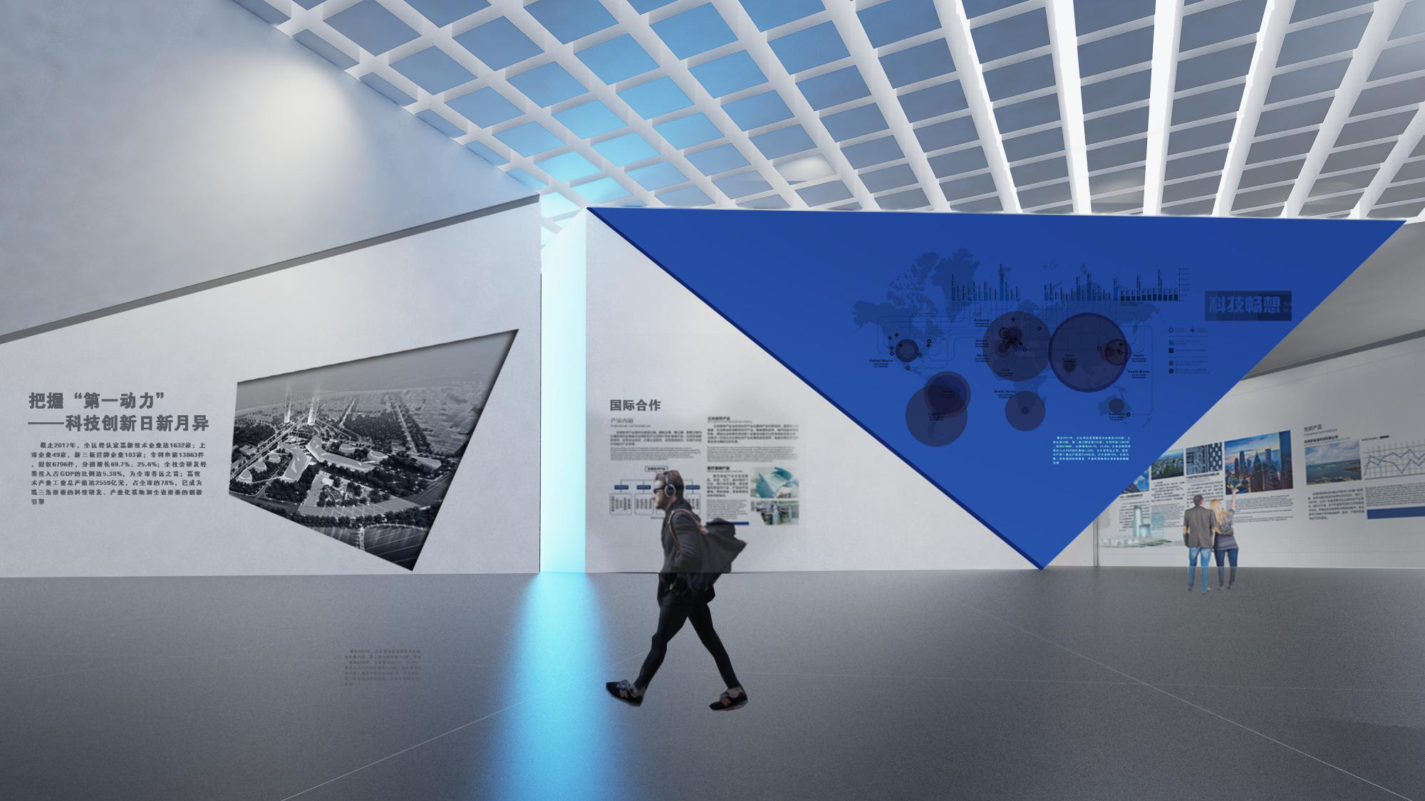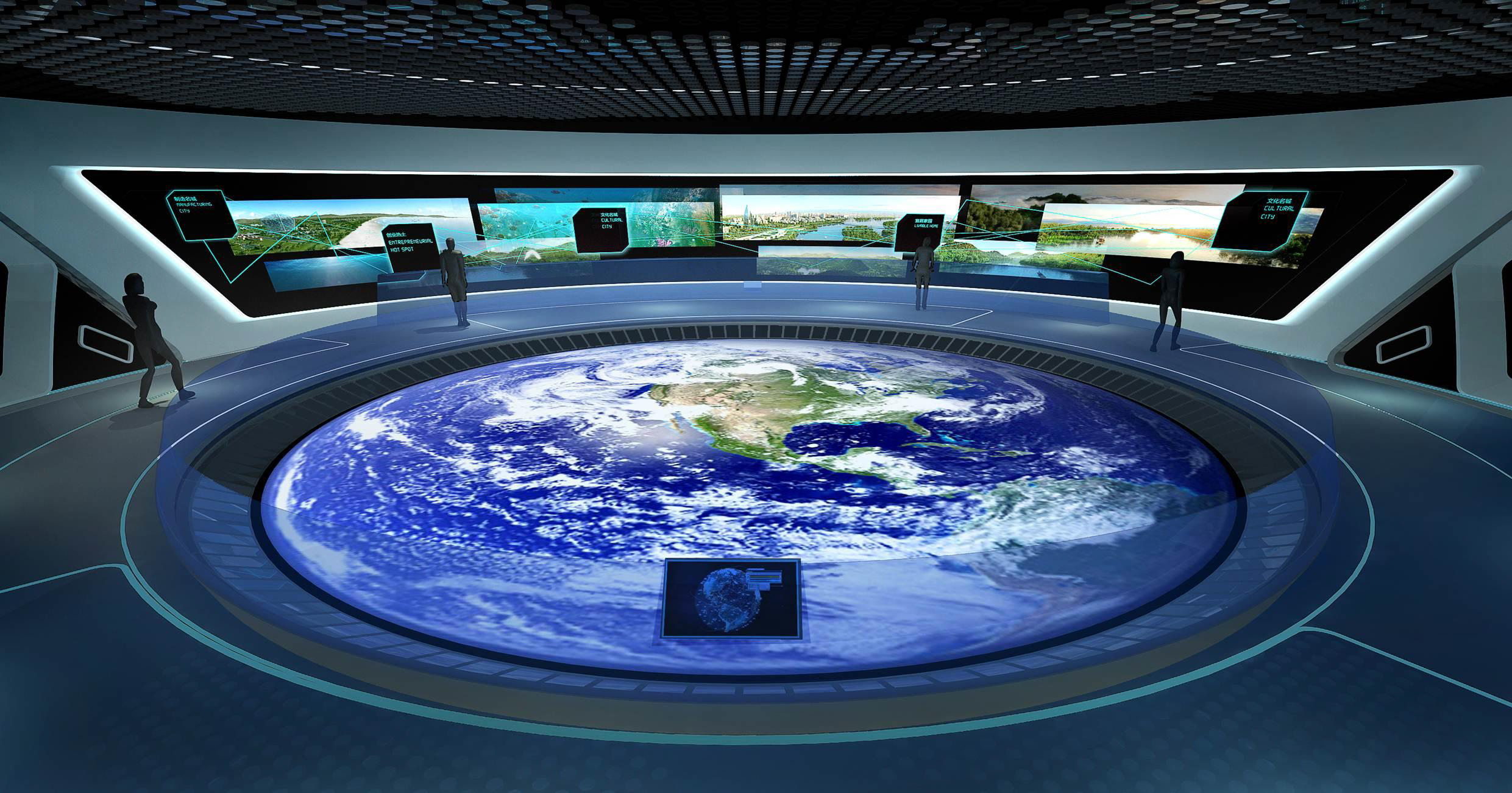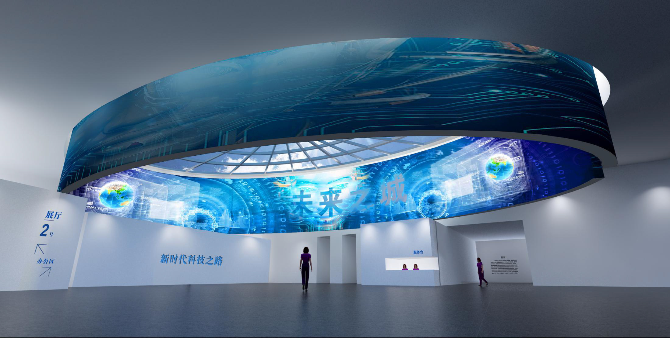 充分考慮建筑現(xiàn)有條件,同時結(jié)合內(nèi)容主題特點,使形式設(shè)計不是強加給建筑,而是建筑的合理延續(xù),本展覽內(nèi)容是科技與未來主題特征,所以設(shè)計追求超時空已經(jīng),利用科技 手段如大型LED環(huán)形屏幕演示主題內(nèi)容。觀眾進(jìn)入展廳猶如進(jìn)入一個未來時空,在這個時空之中我們可以看到未來科技的應(yīng)用,未來新區(qū)的發(fā)展,未來世界的樣子,一個未來的理 想之城以科技手段幻化成為現(xiàn)實。